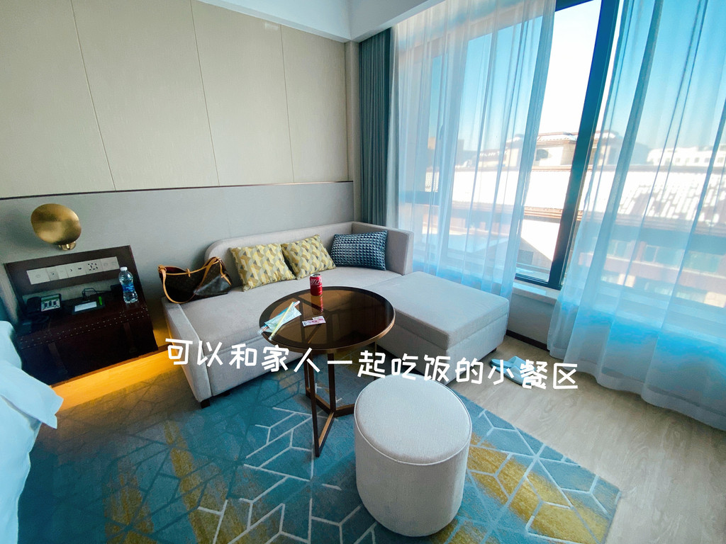 房间功能分区超级人性化:普通的高级大床也在40㎡左右空间,丝毫不拘束,作为这个价位空间我很满意,房间内部功能区分区明确,衣帽卫浴分离,配浴袍。有一起吃饭用的餐桌、沙发、小凳子,还有办公用的小办公区,可以说设计非常人性化,实际住宿感触很深,我们点外卖就在沙发这边圆桌吃饭,2-3人都坐的开,刚好是一个家庭的需求;而我个人办公就在旁边的台灯办公圆桌这里,背靠窗户光线明亮,而且电插座这些桌边配置丰富,电脑办公用起来超方便!