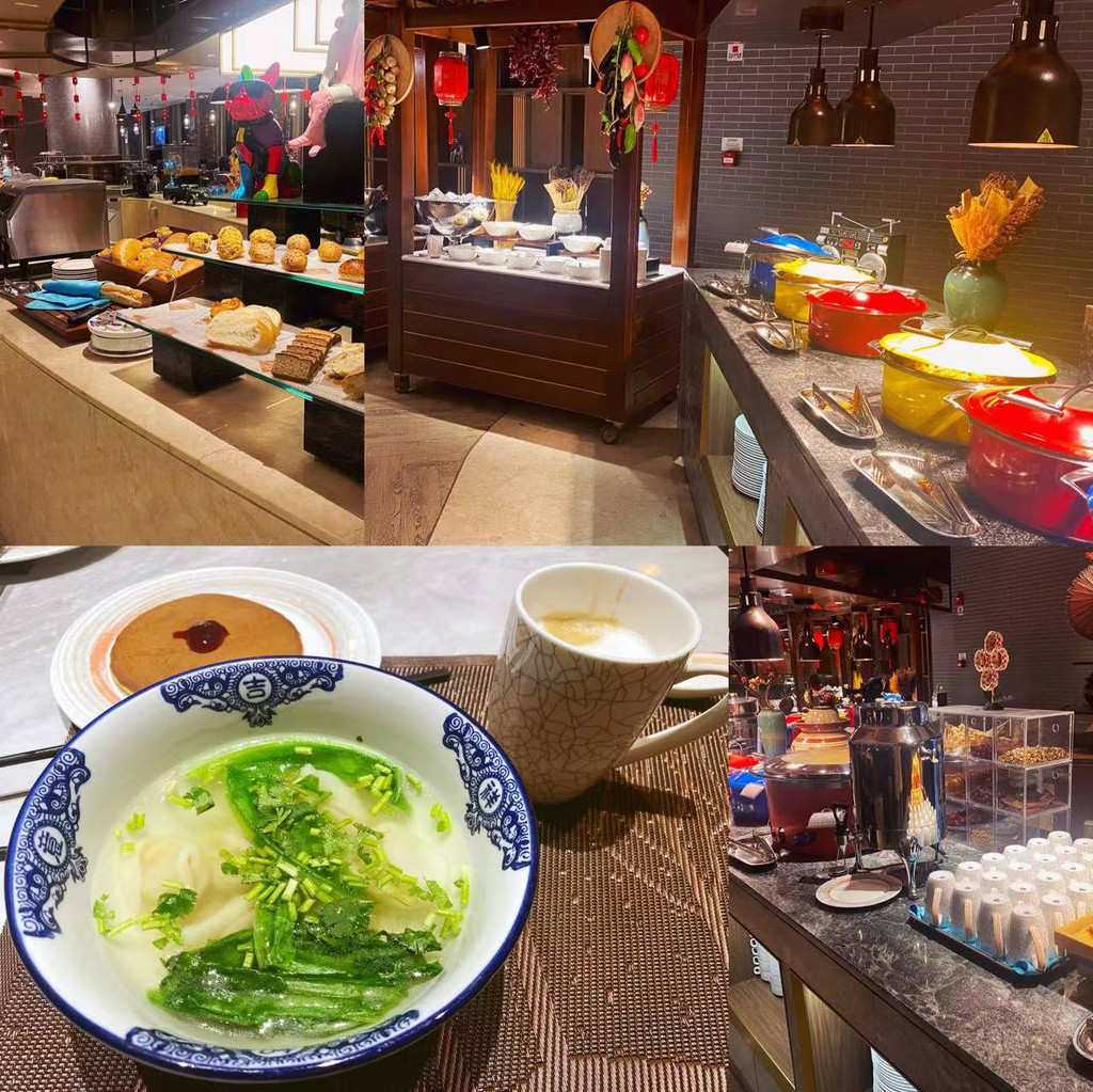 自助餐厅,餐品丰富:住酒店的人非常在意的就是早餐了,假日的早餐配置很完善而且现场烹饪类相对很多,早上六点半就开放,可能这里和某个航空有合作,我早上每天都看到很多空姐空少,真的养眼,哈哈~晚上也同样在自助餐厅这样配置了晚餐自助哦~