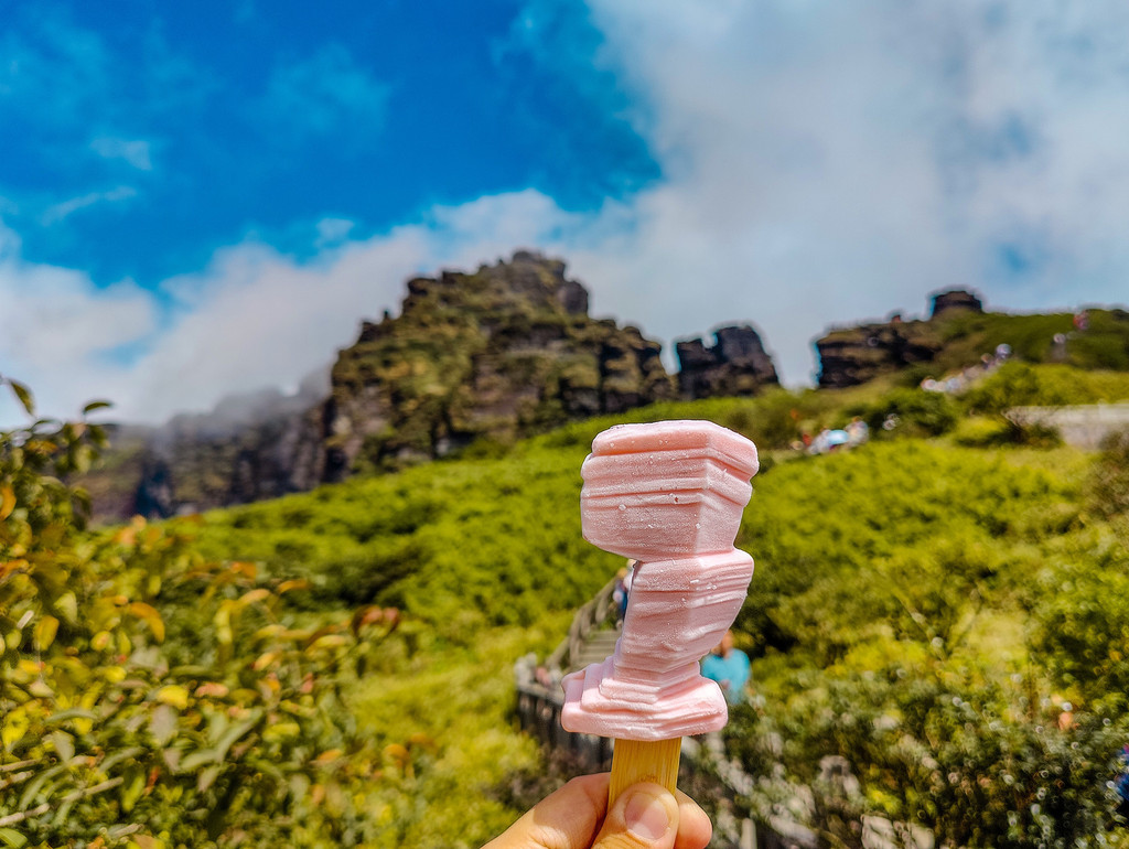 普渡广场上可以买到18块一根的网红文创蘑菇石雪糕,红色草莓口味,也很适合朝着天空打个卡。