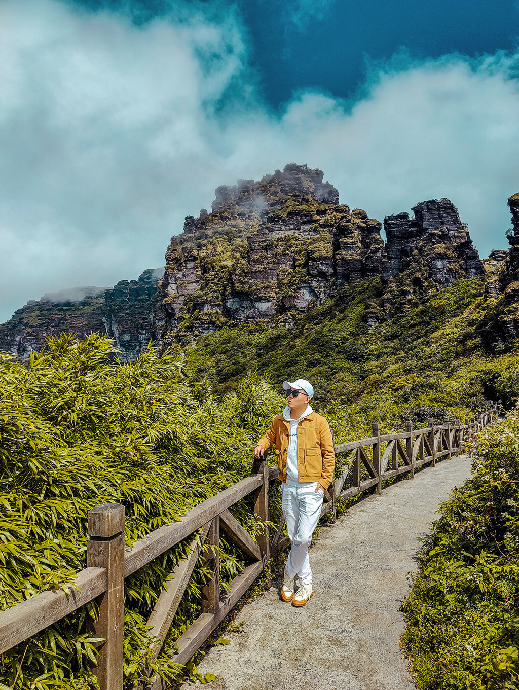 下了缆车需要徒步约一个小时的1200多级台阶的森林步道,才能到达网红打卡点蘑菇石景点群,这里也是第一个到达的超级观景平台,超广角观景平台,视野很开阔,观赏梵净山的红云金顶和老金顶的绝佳位置,也是特别好的背景打卡地。