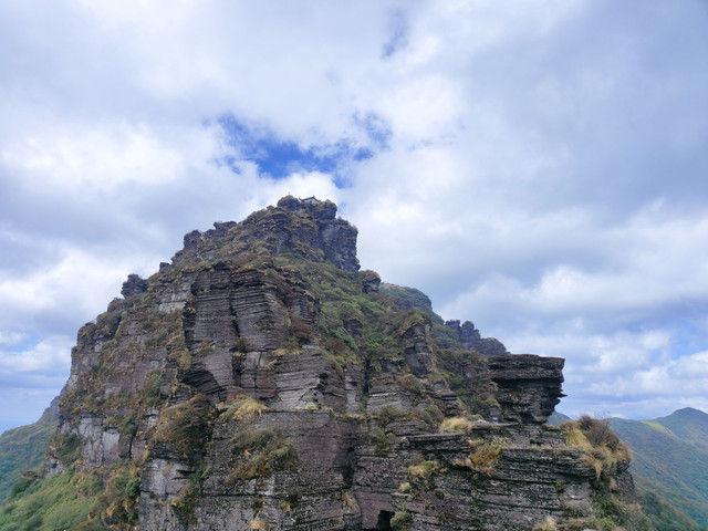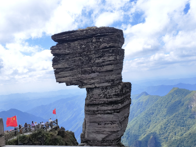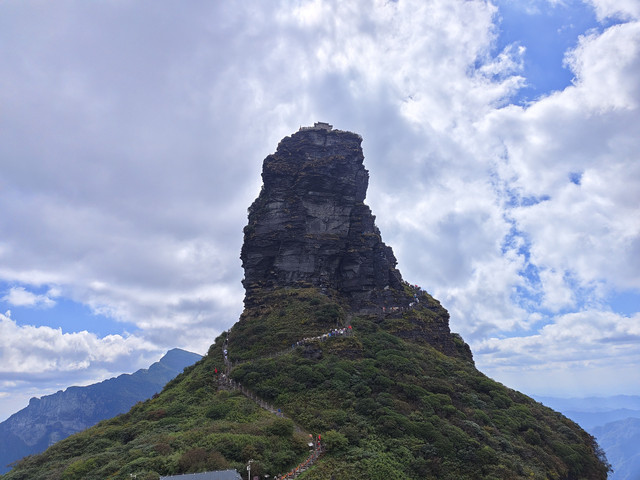 我想我还是低估了徒步梵净山,所有大神投票决定徒步上山,我该带上登山杖的,山路阶梯很陡,一路爬梯。当天山下36℃,山上还是很冷的,风又大,穿短袖我是冷的不行。上午雾很大,能见度很低,如果乘坐缆车上山可以拍摄云海,因为背无人机稳定器等装备,没能带多水和吃的,我自己是带了2瓶水,山上水10块一瓶,我一共喝了5瓶水,景区炒饭30元,看起来平平无奇,但是味道很不错。13:40到达山顶平台,平台不大,如果是往年的旺季这平台肯定是走不成路了,山顶平台有个蘑菇石,长的甚是奇特,层层岩石形成个不规则山形,梵净山不得不说非常的壮观,红云金顶耸立于山顶,空气无比清新,登顶道路狭窄还是需要排队的,登顶后景色美的难以形容,老金顶造型也甚是奇特,站在山脚有种压迫感。建议先去老金顶-护国寺-红云金顶,红云金顶出来有左边可以下去坐缆车不绕路。