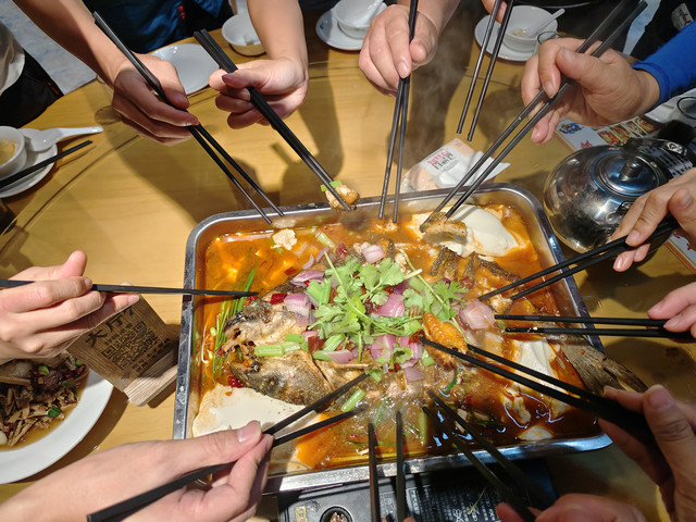 早晨6:30在附近吃的永州卤粉,卤粉感觉还是没有湖南其他地方的好吃,人均7元。后驱车前往铜仁大峡谷,中午12:30分到达,到达后就找了家大家心心念念的贵州酸汤鱼,鱼是用的黄骨鱼,我还是觉得用本地的湖里的鱼味道会更好,不过还是很香的,酸辣酸辣,我们整了5斤,人均70元。