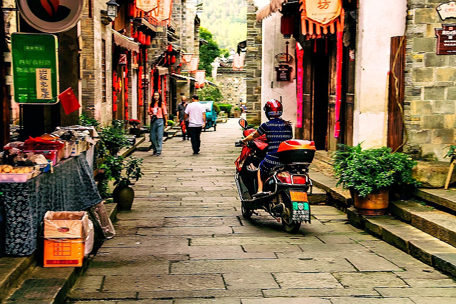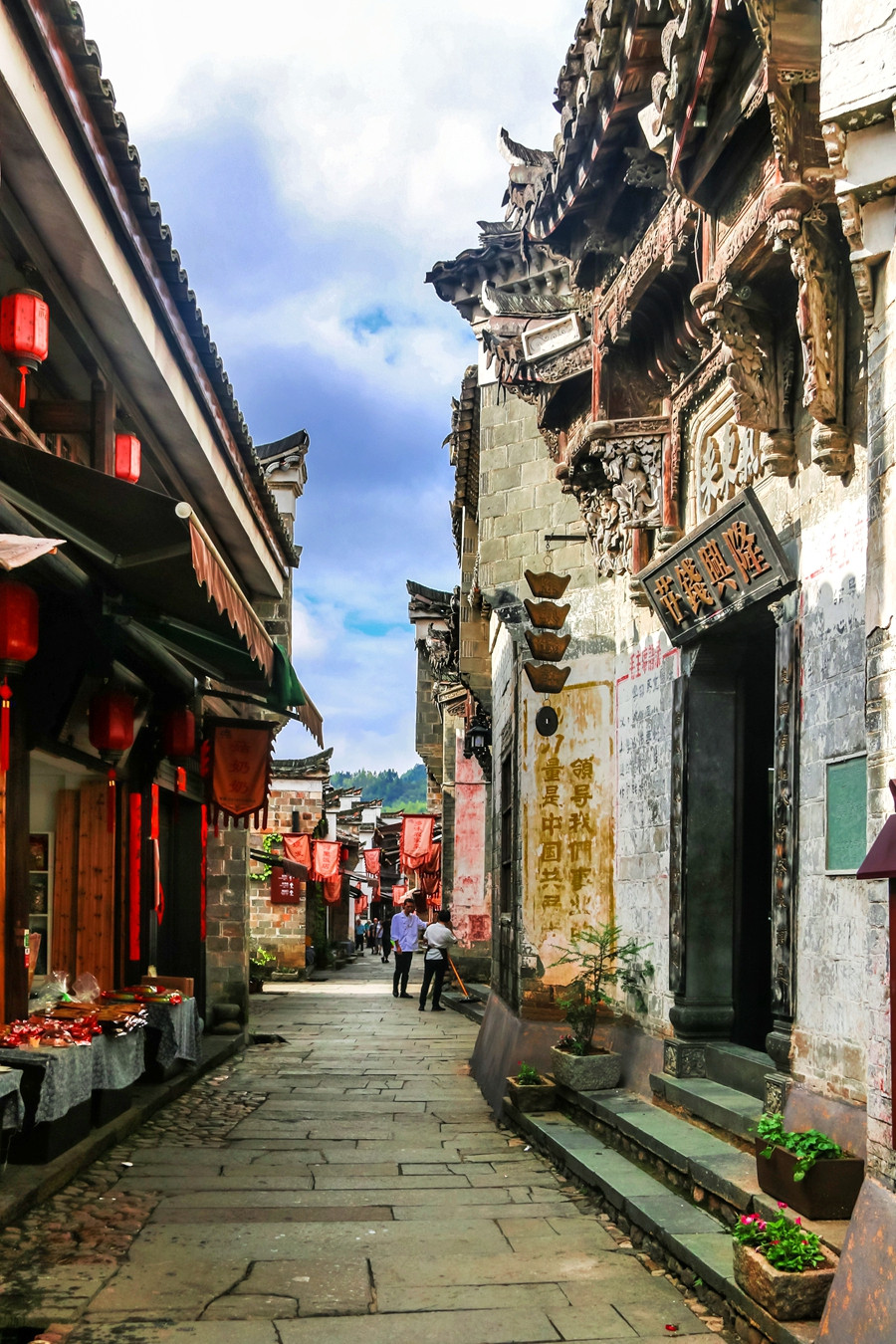 沿街都是如此座座门楼,古街风格独特。古街两侧排列着整齐的店铺,每户一般是三间店面,间以高耸的马头墙。