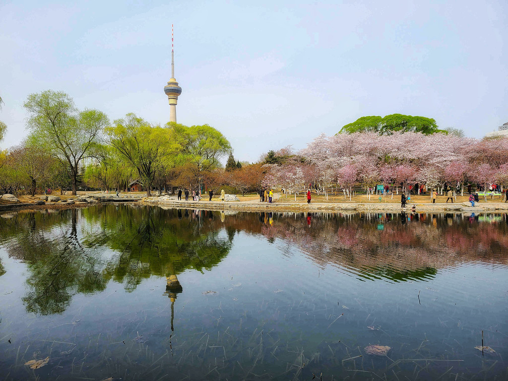玉渊潭,如约绽放的樱花和中央电视塔交相辉映,春意十足。