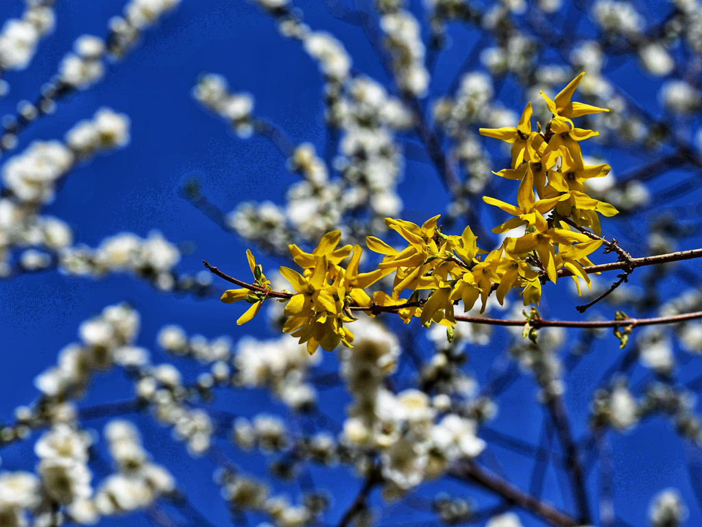 公园东北角的报春亭,曲径通幽处,春亭花木深。此处无人,独赏连翘和梅花争春。