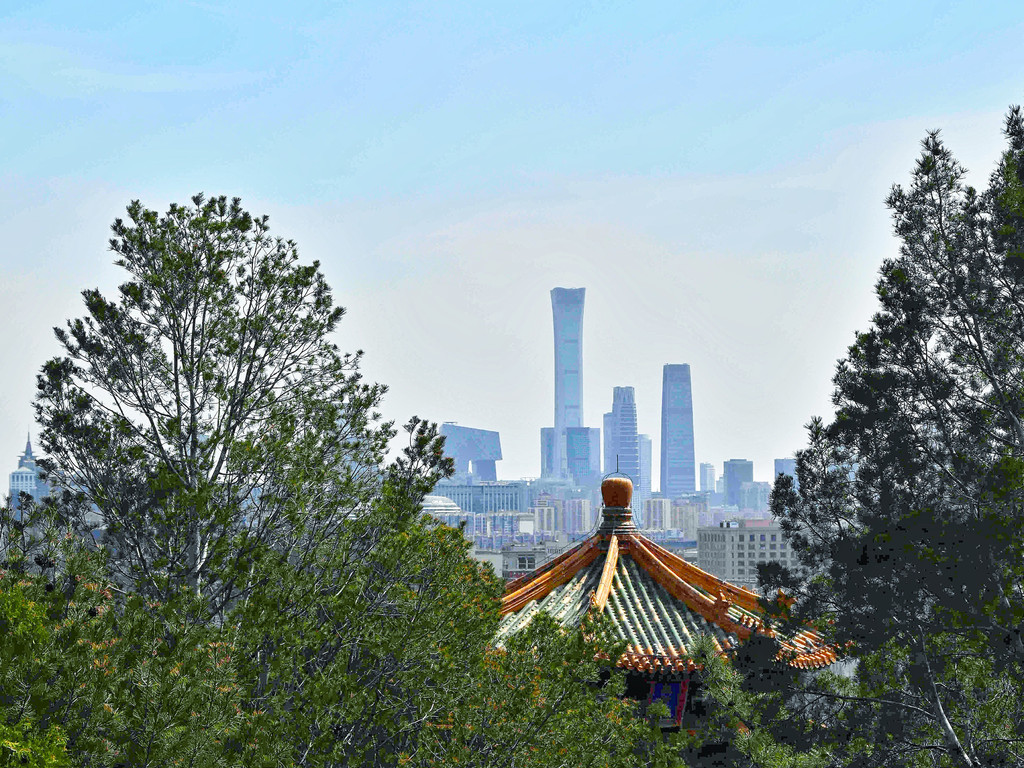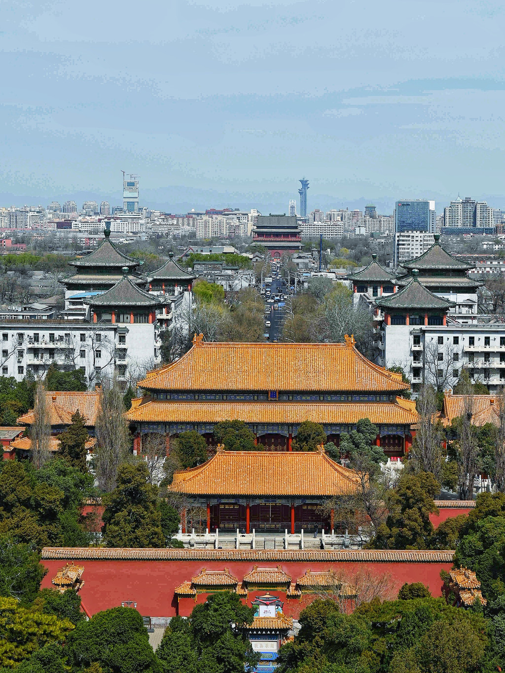 北望:寿皇殿、鼓楼、奥林匹克塔,一览无余。