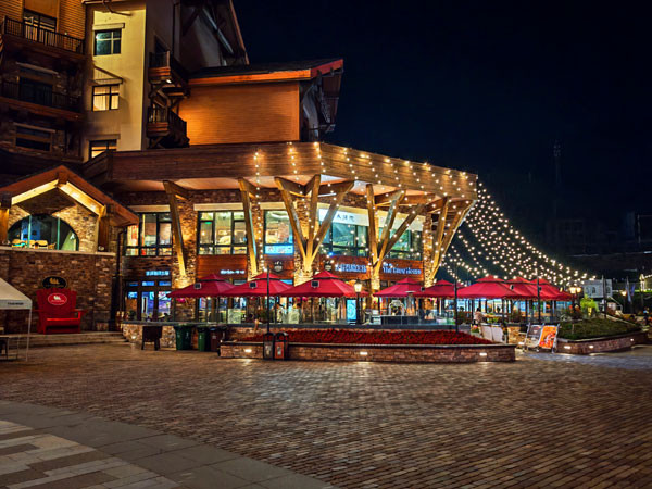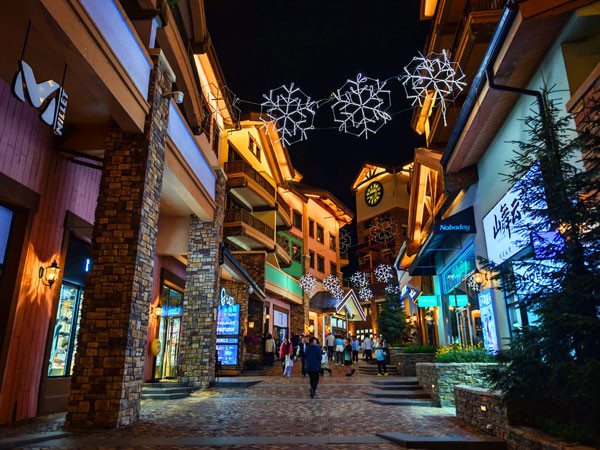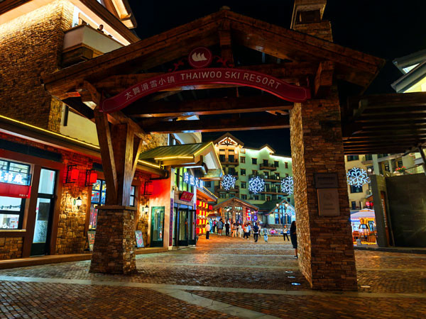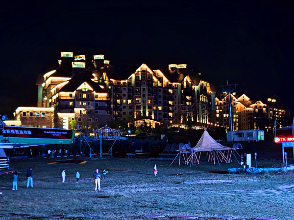 晚餐后,我们开始夜游太舞小镇。只见,傍晚的余晖刚漫过太舞小镇的红屋顶,路灯便一盏盏的亮了起来,像串起的星子落在北欧风情的街巷里。白日里清冽的山风染上了几分暖意,带着烤面包和精酿啤酒的香气,怂恿着人放慢脚步在此徜徉。