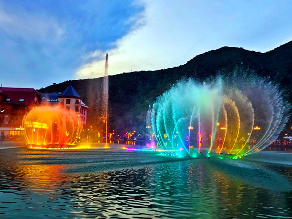 特别是富龙小镇上的音乐喷泉与表演深受游客的喜爱。白天游客们围在小镇中心湖畔的周围,观赏喷泉随音乐起舞变换的婀娜多姿的景致。