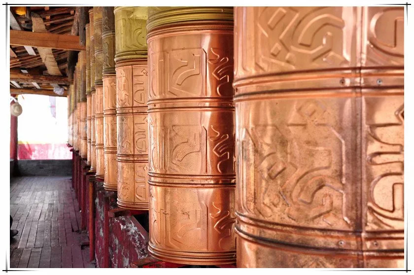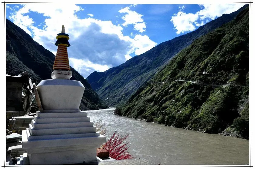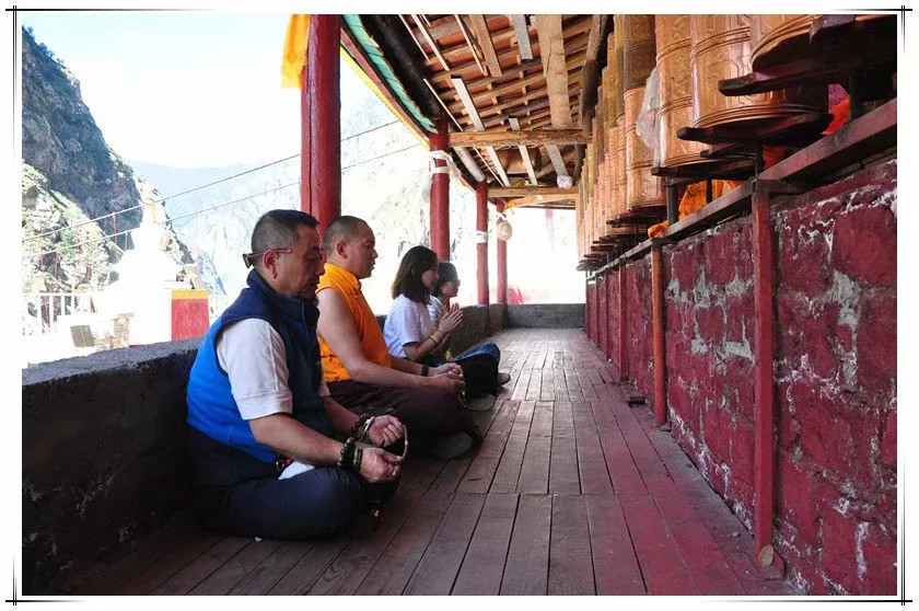 修行的道路总是艰苦的,且不说道路狭窄、坑坑洼洼,有路可走已是好的了,第一次坐着车子过索桥,车轱辘的声音直击心灵。冲下一个碎石坡,破了一个轮胎,停下来补胎的时候,山顶还有小碎石一路滚下一片尘烟。风景却是独好,两岸青山次弟开,两江汇流清浊明。谷间水瀑气势恢宏,奔腾而下,遇石而转,在山间独自狂欢。索桥上系满经幡,迎风烈烈。在莲花生大师修行地,师父诵经祈福,尘嚣远离,自然心生。
