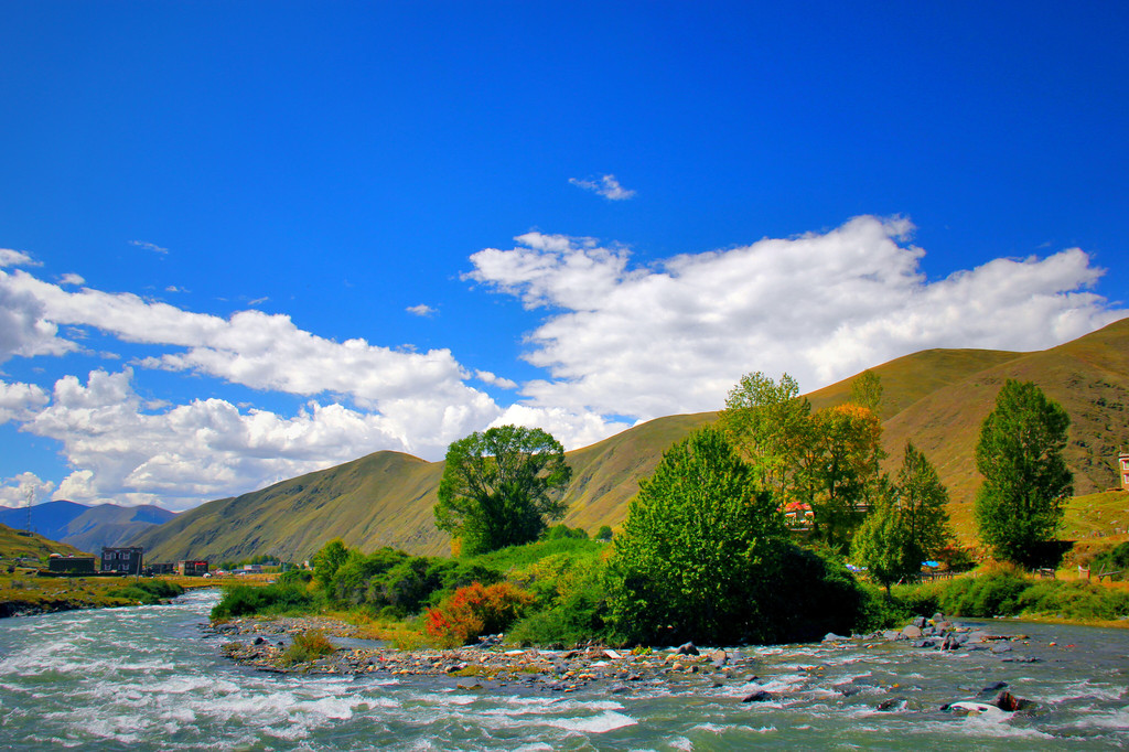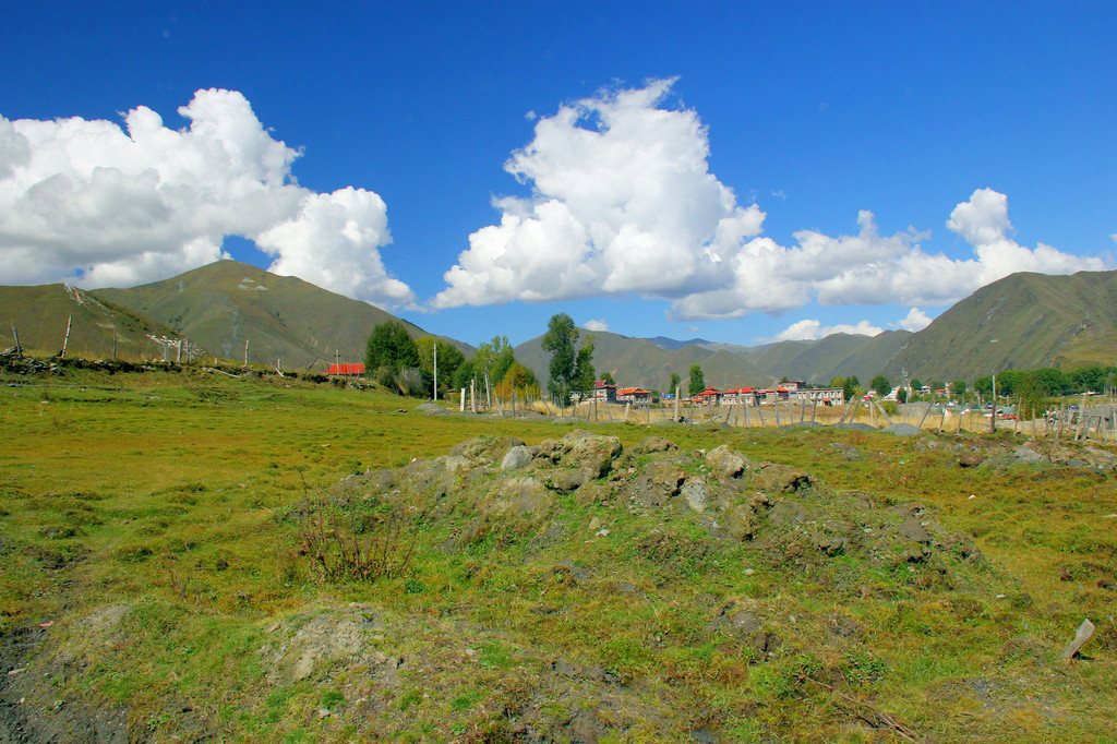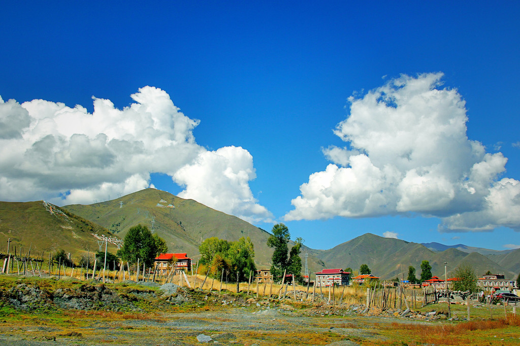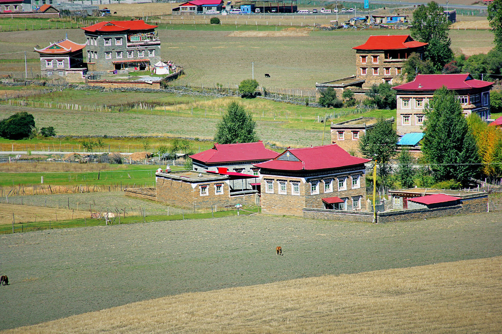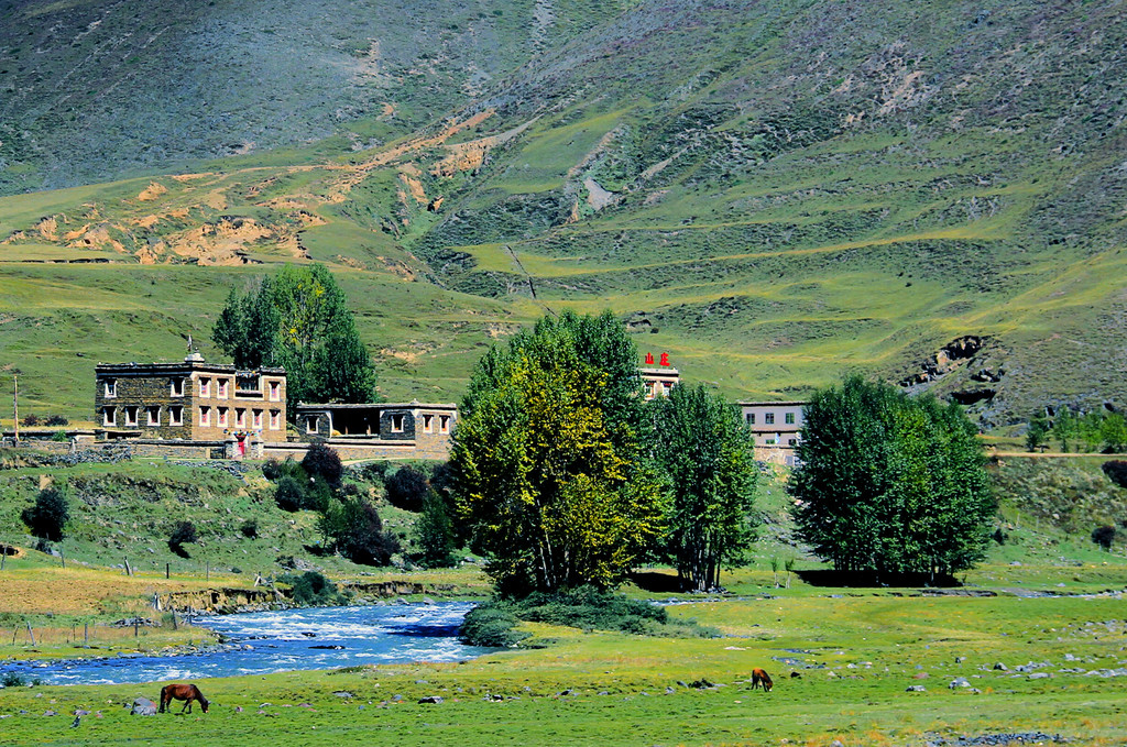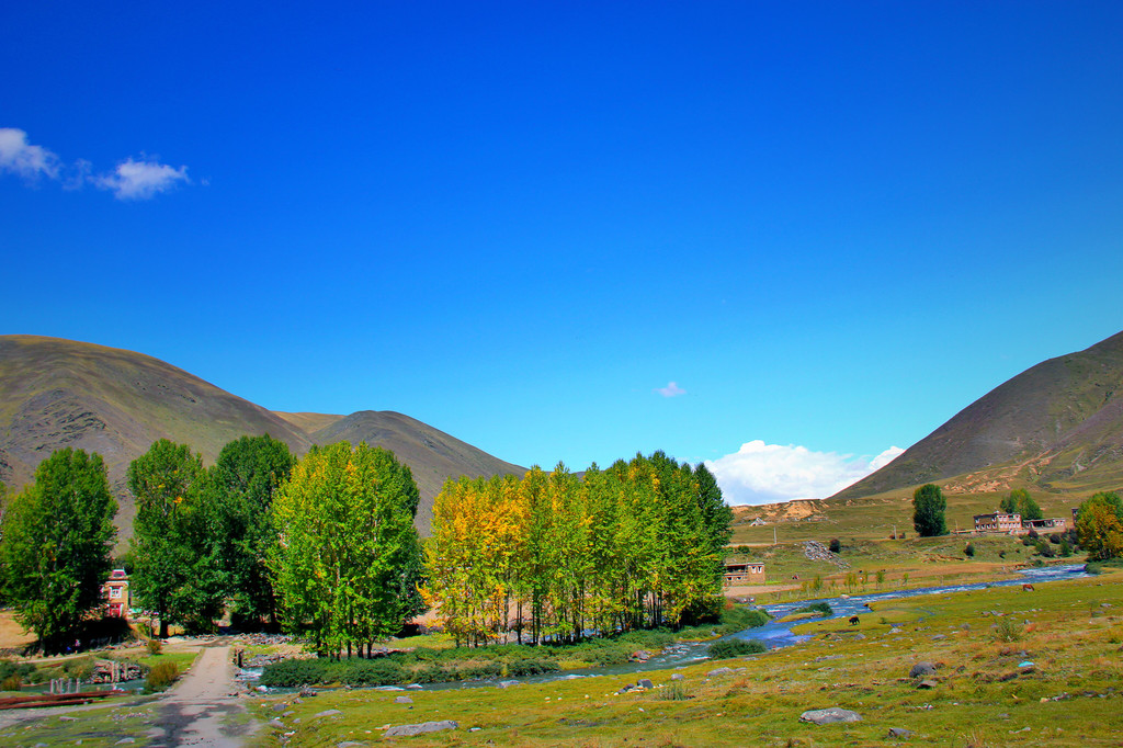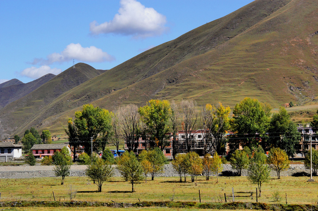 折多山翻山后,沿着川藏公路南线前行,只见一个个典型的藏族村落依山傍水地散布在公路两旁,一条浅浅的小河与公路相依相偎地蜿蜒流淌。房前路旁矗立着一棵棵挺拔的白杨,在秋风秋阳中炫耀着特有的金黄。一群群的牦牛和山羊,点缀在新都桥田园牧歌式的图画中,平添出许多生动。远处的山脊,舒缓地在天幕上划出一道道优美的弧线,没错这就是新都桥。