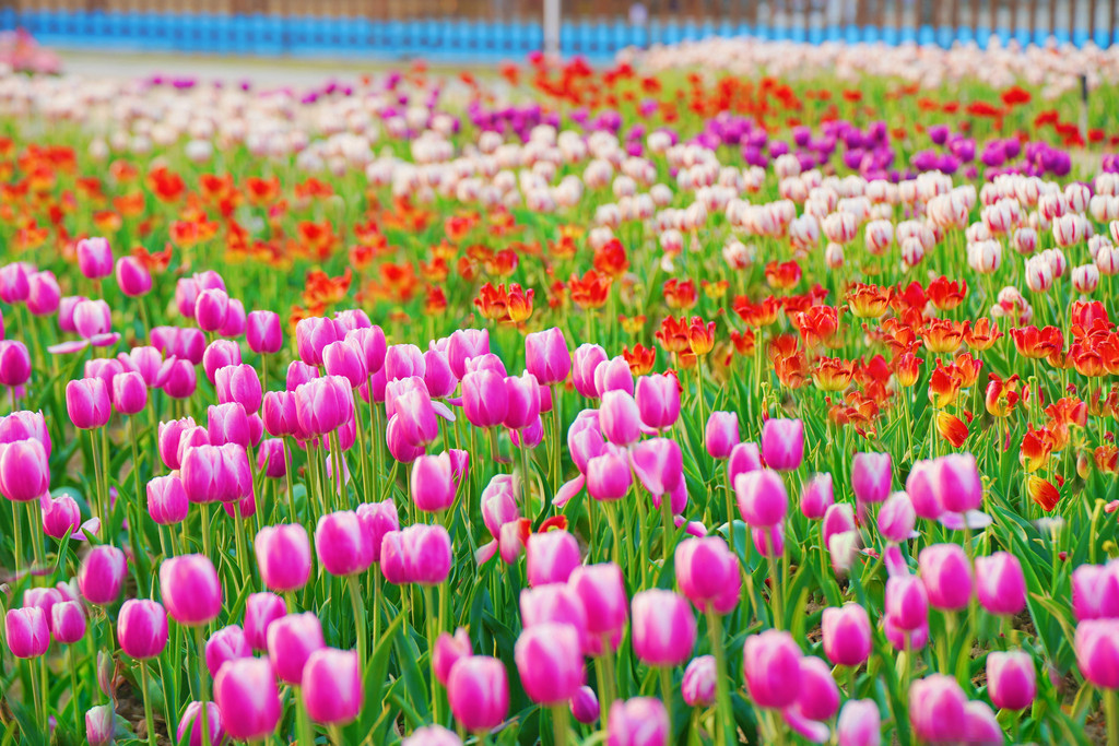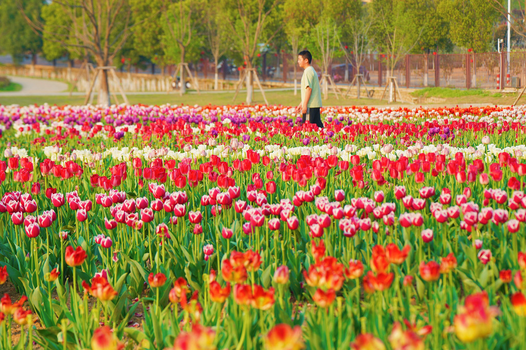 在夕阳的照射下,形态各异,五彩缤纷的各色郁金香,芬芳吐蕊,一派生机盎然的景象,美得令人陶醉。