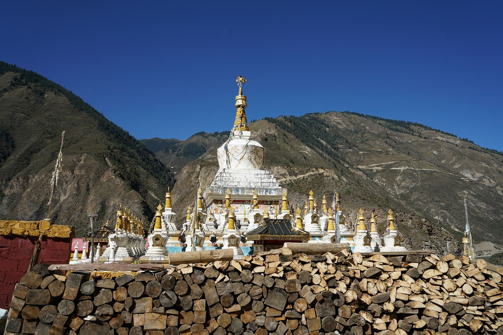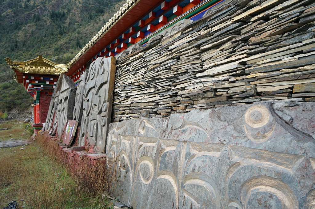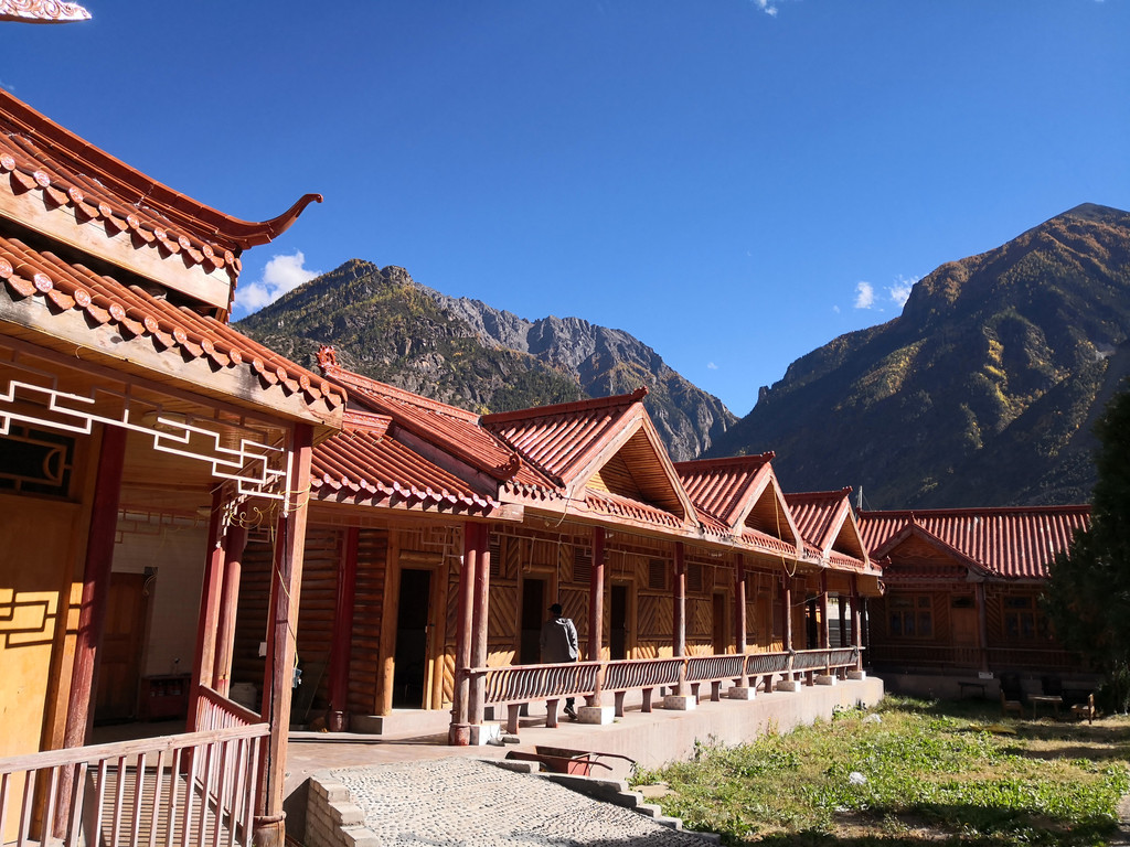 新龙民居与之前看到的藏居明显不同,底层是传统的夯土墙,整个建筑下大上小,雄壮粗犷,有特色的是他们点缀式地在二三层架设1-3间“崩科”( 在藏语里,“崩”是指木头架起来的意思,“科”指房子,“崩科”就是用木头架起来的房子。),在门楣、窗框精心雕刻着吉祥图案,用不同的色彩进行着色。