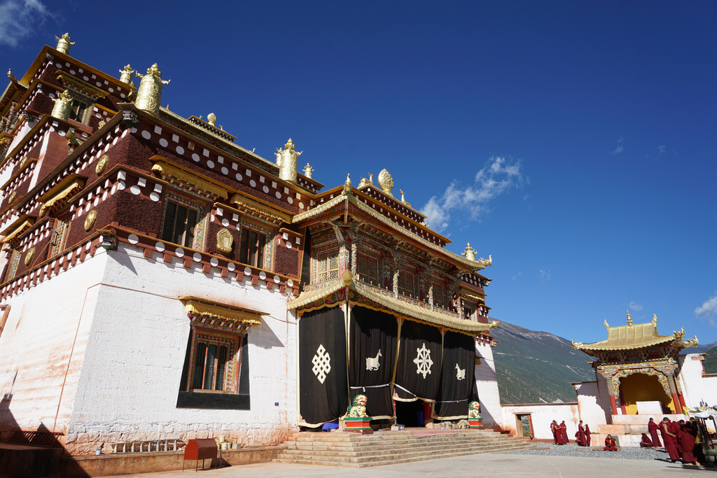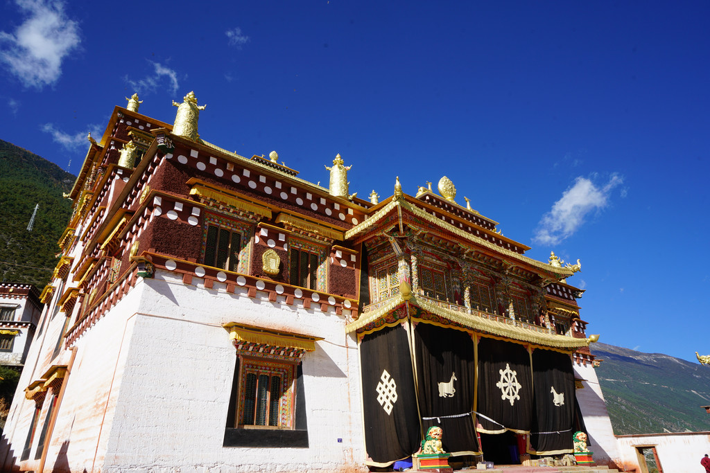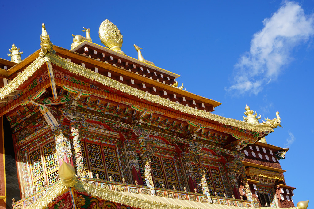 桑披岭寺,精美的雕刻、绘画作品随处可见,各类佛像、鸟兽造型千姿百态,柱头、梁坊、廊顶等处描绘着藏传佛教常见的各种吉祥图案。