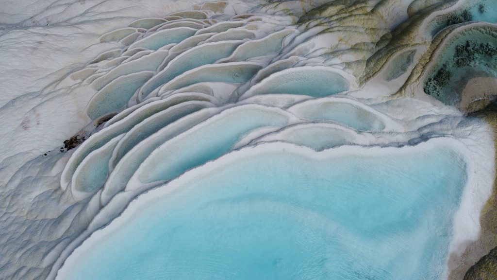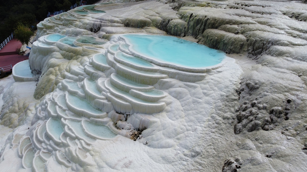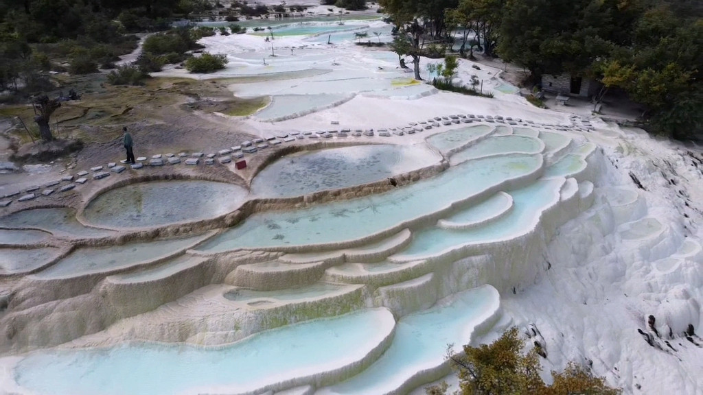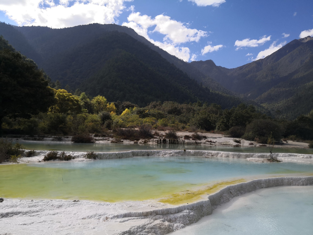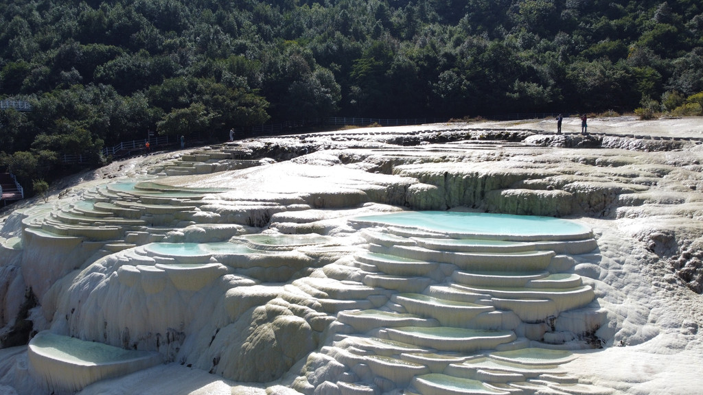 走香格里拉东环线至白水台景区,景区左上右下,围绕着纯白如脂的白水台,层层叠叠如瑶池仙境。