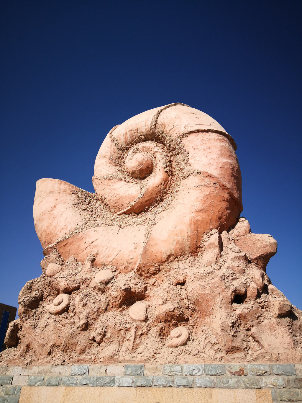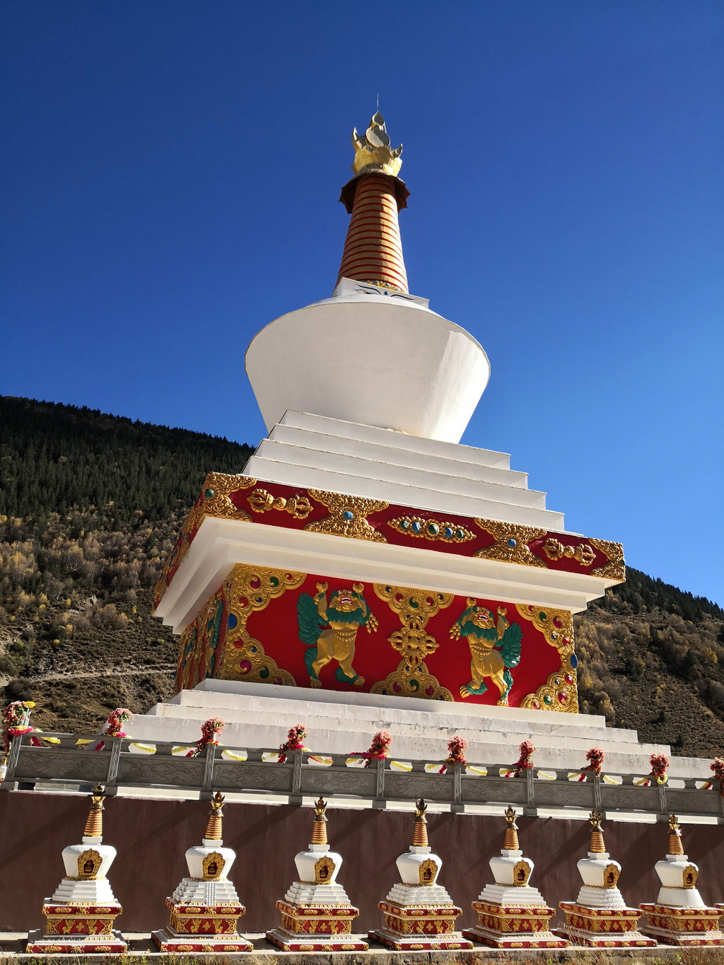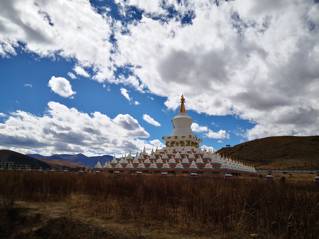 先路过白塔公园,大门是关闭的,下午返程时,再次路过,看到门上有纸条写着“开门拉线”,原来是可以进入,但要随手关门。白塔公园中有 119 个小塔环绕主塔,形成了别具一格的塔林,这 119 个小塔分别代表全县 119 个村子。主塔高 33 米,小塔高 2.5 米,还有大转经筒,在蓝天的映衬之下,气势雄伟。