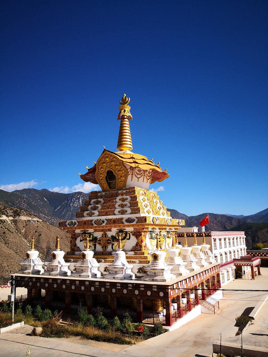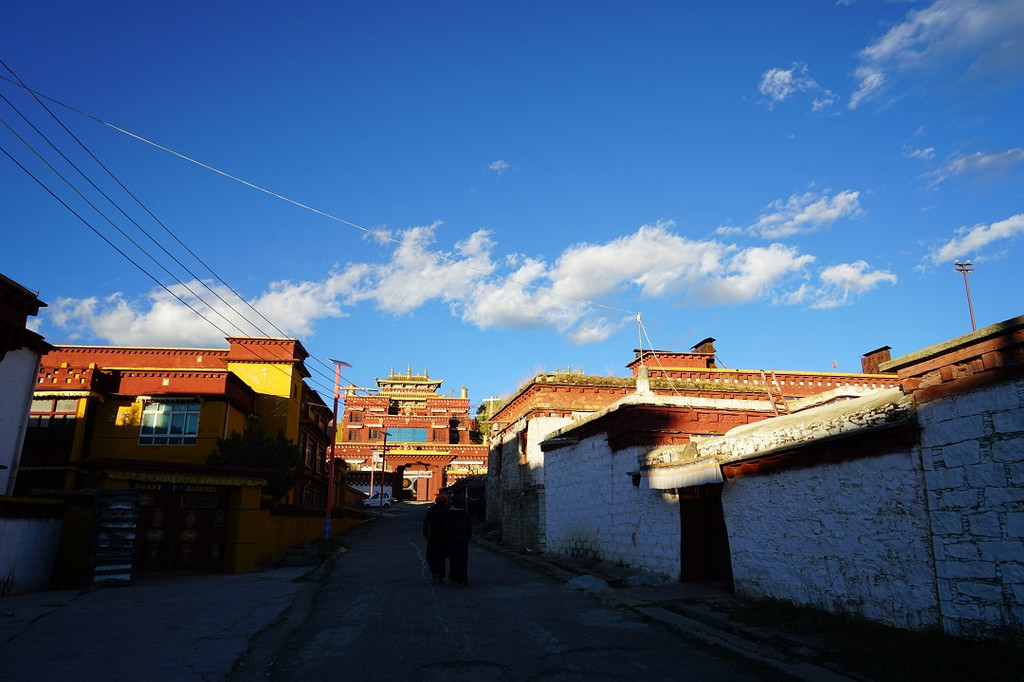 安顿好,看着天空湛蓝,去理塘长青春科尔寺看看。金碧辉煌的寺院,四周绚丽的壁画在夕阳的照射下泛着金亮的光彩。