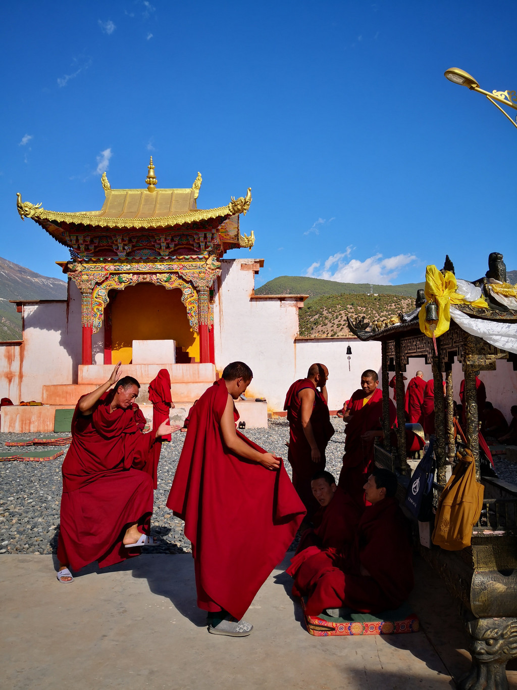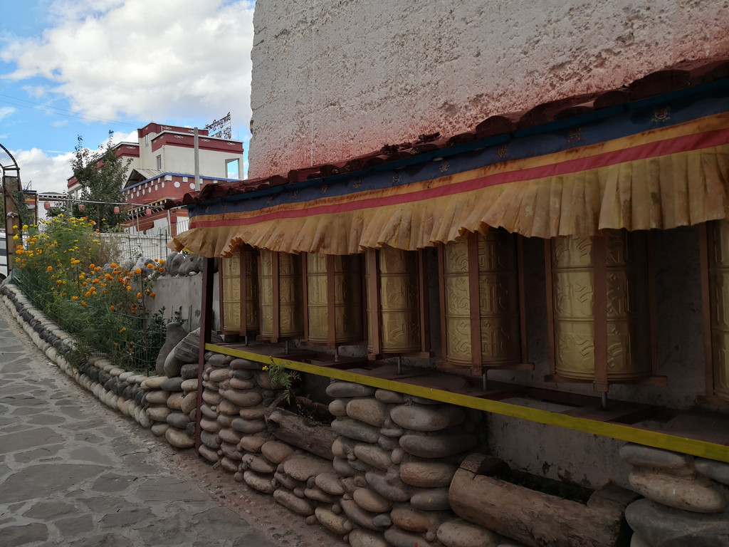 日拉寺,外墙红蓝白相间,属于萨迦教派。寺院喇嘛带领我们参观,他在这里已经学习3年,瘦高身材长相俊秀。