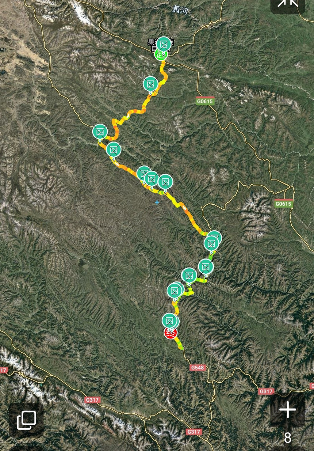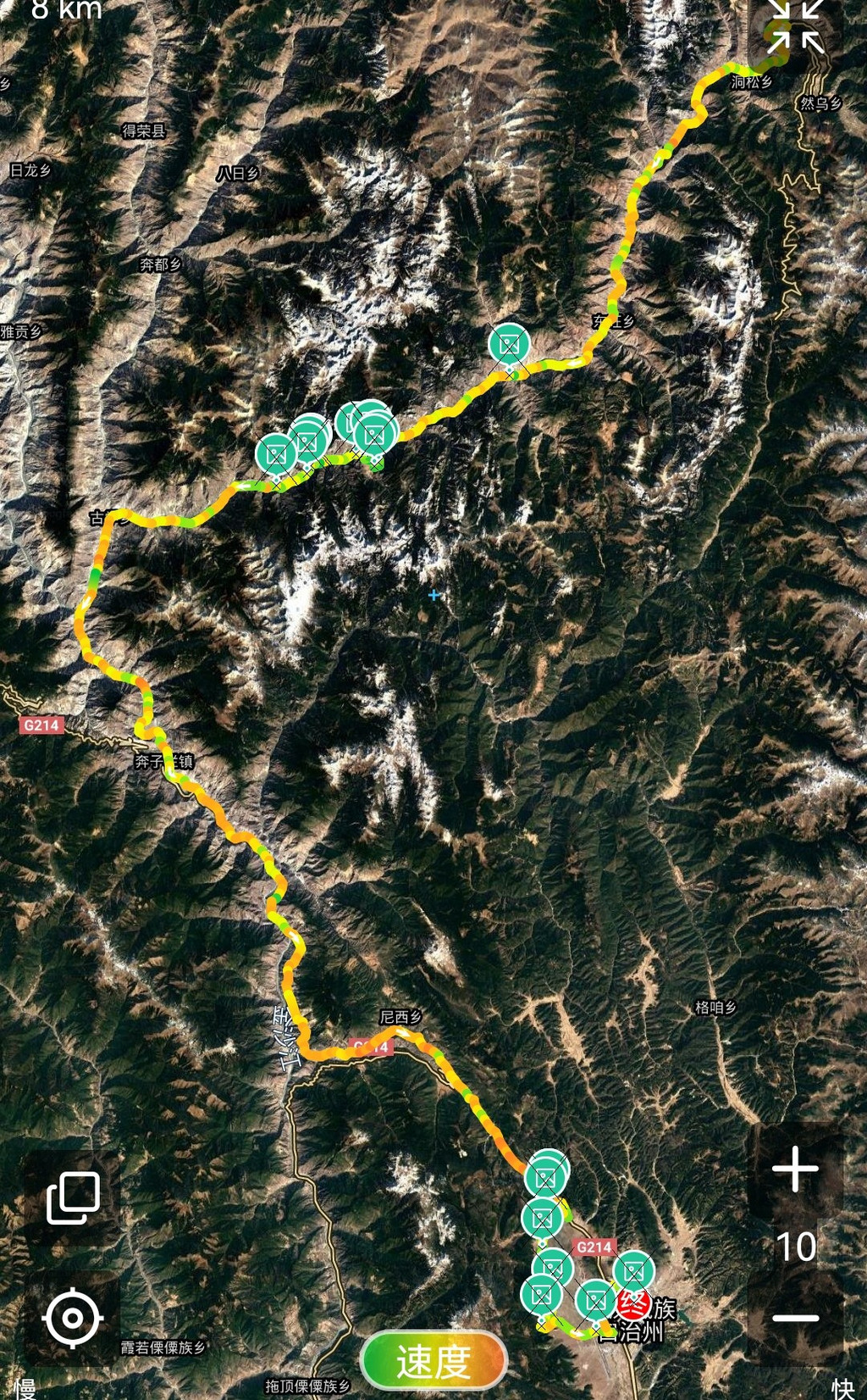 今天未记录轨迹,色达走6983县道(过乃龙山雪山),走317国道、227国道(雅砻江大峡谷段)至新龙县城,约240公里。