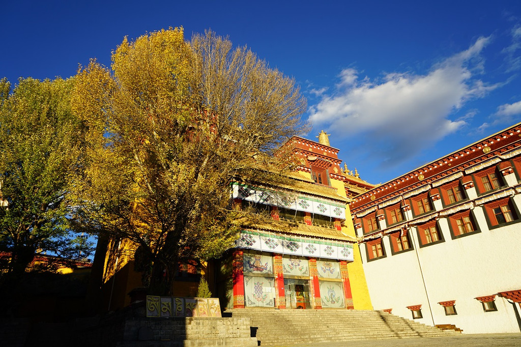 秋季的格聂,纯净的天空、金黄的草、碧绿的水、满坡的彩林,是一片大型风景区。