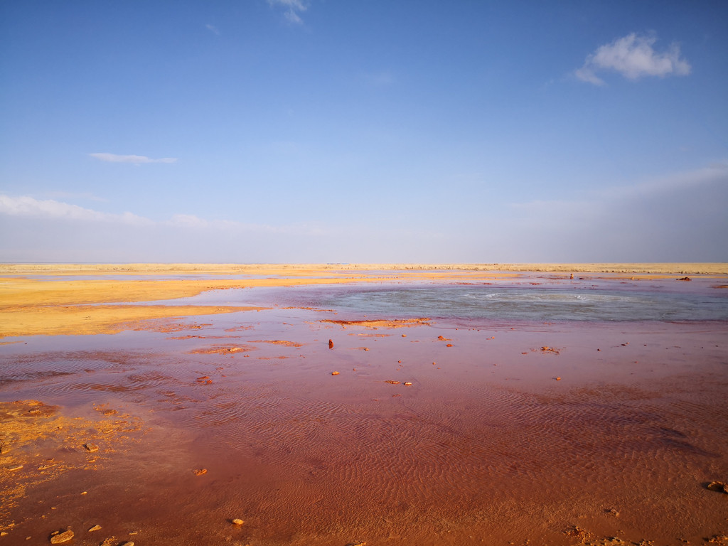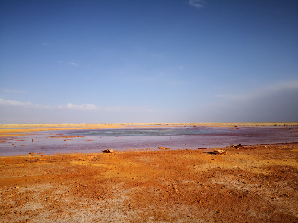 艾肯泉:从国道315进去没多远就都是土路,整体都比较平直,一个多小时可以抵达艾肯泉。艾肯泉直径有10多米,看标识牌,它还是响泉,人声越大泉水越大。泉眼如同沸腾的开水,不断翻滚上涌,泉眼周围硫磺矿物长期沉淀,色彩斑斓。从空中俯瞰,泉眼与喷涌而出的泉水及周围土地深红色环带状的沉淀物,组成了一个奇特的瞳孔造型,仿佛一只镶嵌在大地上的眼镜,所以大家都称为“大地之眼”、“恶魔之眼”。
