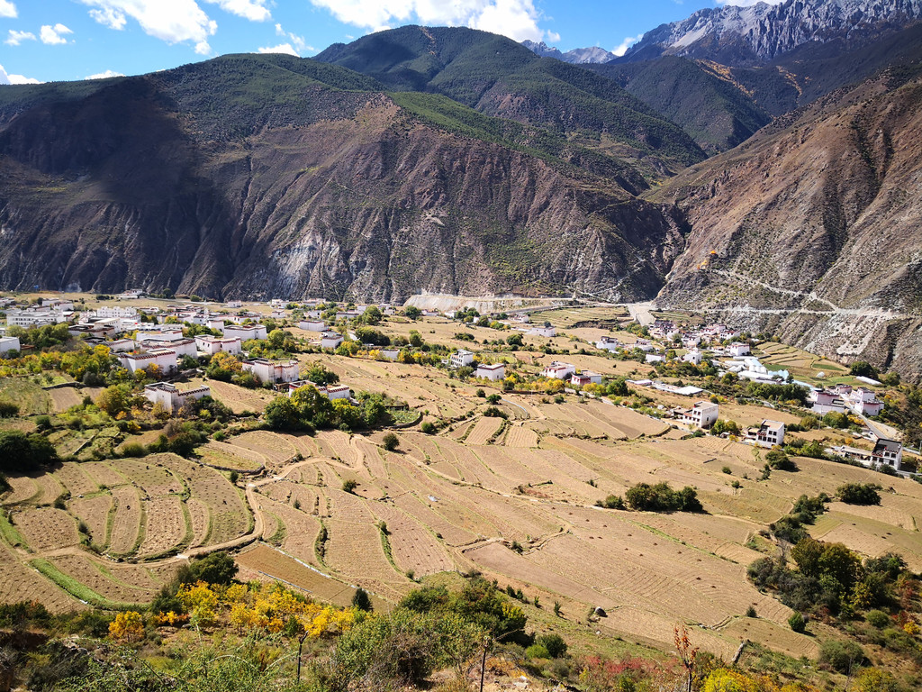 拍完格聂之眼,沿着土路下到村庄,河流从远处的雪山走来
