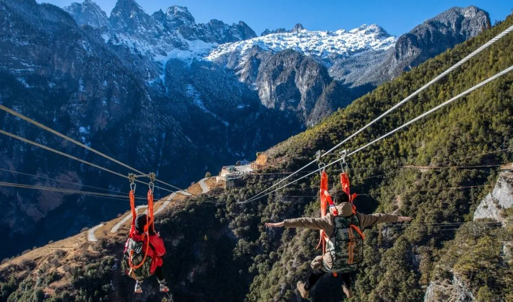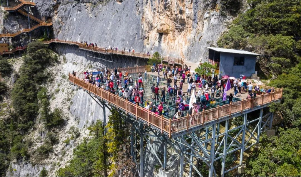 栈道全长1.5KM,四周都是高耸的山脉,真的有很大的回音!还能在这儿体验高空索道,非常刺激!