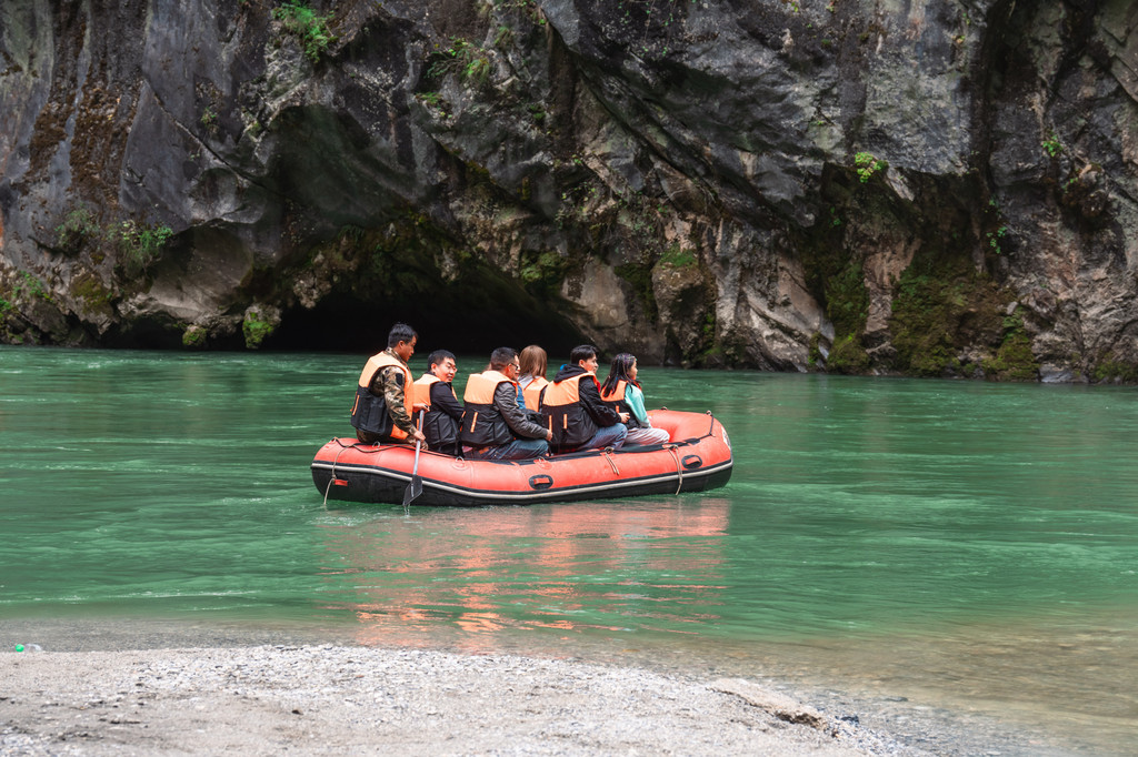 徒步2.5公里栈道,回程可体验峡谷漂流(¥120/人),深秋的峡谷两岸崖壁染秋色,碧水倒映金顶红叶。