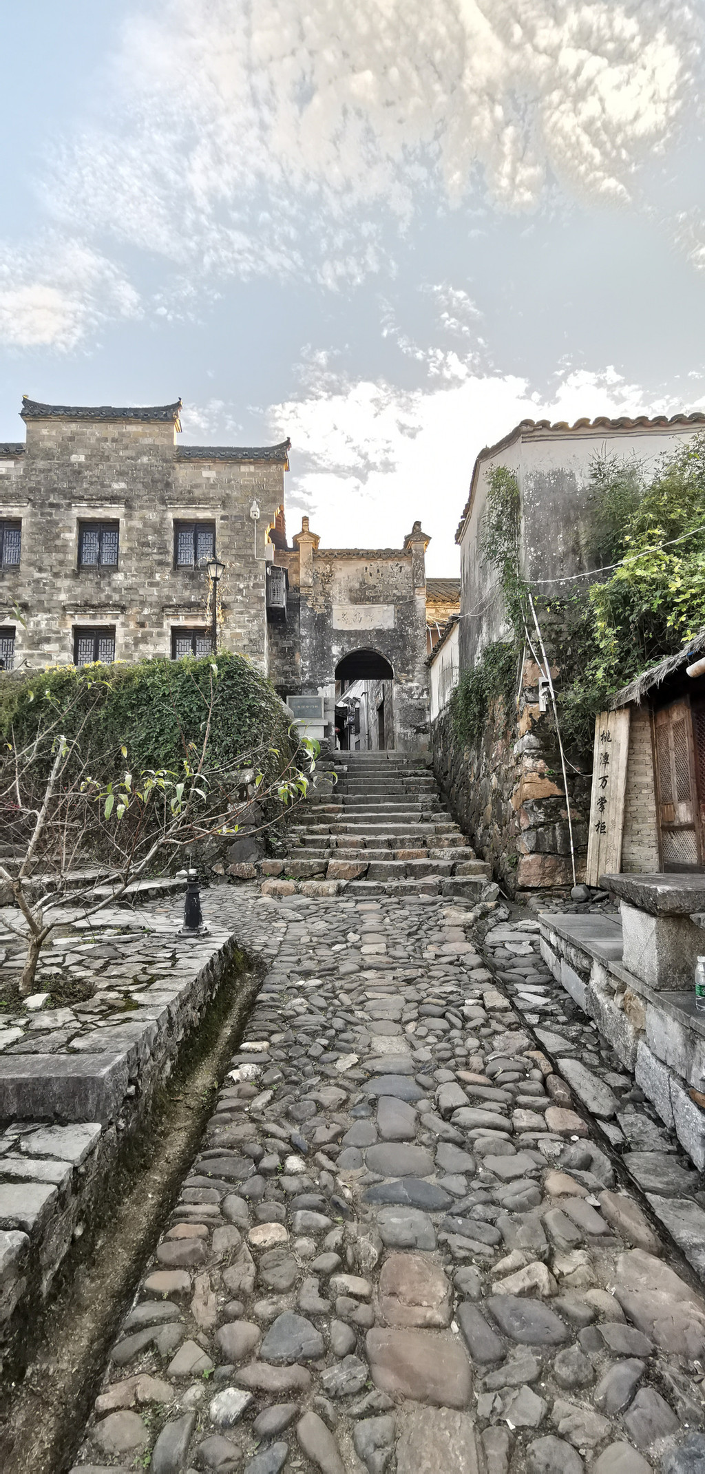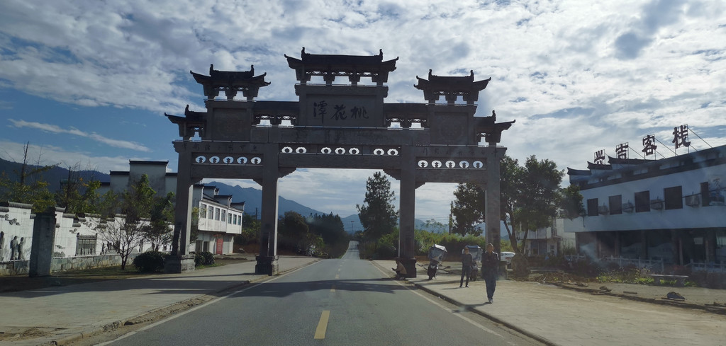 鹅卵石铺就的道路,石坊上有“桃潭西岸”四字。