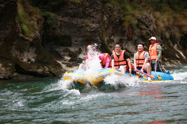 河水更为凶悍强劲,昂头撤蹄,湍湍东去。一滩连一滩,一浪挽一浪。百里河流百里滩,百里流水百里浪。茅岩河水无情地撞击着河中根基深厚的礁石,尽管撞击得头破血流,断肠裂肺,粉身碎骨,依然无怨无悔,从不停歇地演绎着生命的壮观。被撕碎的生命化成点点银珠抛上天空,继而又落回永不消逝的躯体上,织就了一幅生生不息的王母娘娘洒降甘露图。而被河水冲撞了千百年仍然傲然屹立的礁石,撕破了河水刚刚要向人展示玉脂般的肌肤,又被汹涌而至的河水淹没,再次击起满天银花。前进与阻挡相搏发生的巨大轰鸣,在河谷里一次又一次的回响,在群山中一次又一次地震荡。若乘坐皮筏或小舟在河上漂流,一种无以言状的享受游走在每根神经。人时而被软若无骨的河水抛上浪尖,时而又被它牵扯着跌入峰谷。会不由自主地发出享受大自然赋予的刺激的无险惊叫。尖叫声与浪涛声汇成了一支欢乐的乐章。