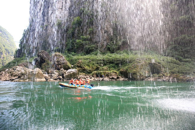 茅岩河沿途的众多飞瀑流泉中,尤以水洞瀑布最为壮观迷人。瀑布从70多米高的峭壁泻出,漫流过三级凸凹不平的峭壁,形成长短不一的三叠,瀑水在每级的石台上漫过突兀出来的沟沟槽槽飞流而下,或宽如银河,或窄似白练,或似垂挂的水帘,或似串串银珠,飞落茅岩河中,撞击得河水颤颤悠悠,鳞光闪闪。