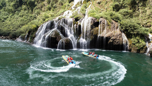 从茅岩河两岸绿绿葱葱的群山里流出的众多飞瀑。更给茅岩河增添了原始的野性美。一挂挂飞瀑流泉,从陡峭的峰腰峦肚中飞流直下,吞云吐雾。晴日,在阳光的照射下,似无穷滚落的五色彩珠,煞是美丽。