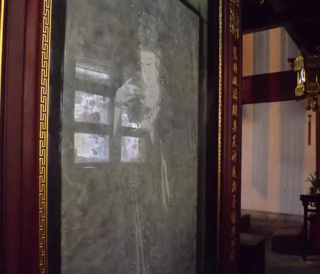 杨枝庵300多年来,殿宇几经废兴,幸运的是这块普陀三宝之一的唐著名画家阎立本绘杨枝观音碑一直都被珍藏着,没有损坏。阎立本为唐初著名画家,传世作品极少,至于佛像仅此一帖,可谓稀世珍宝。杨枝禅林第一重天冠殿;第二重天王殿;第三重杨枝观音殿,中供泥塑贴金杨枝观音立像;后面竖“杨枝观音碑”,碑上中间鎸刻观音大士立像,珠冠锦袍,缨络飘披,面部丰满,雍容华贵,脸似冠玉,右手执杨枝,左手托净瓶,妙相庄严。此画像整体线条流畅,造型壮丽,刻划细腻,雕刻刚柔相间,造诣深湛,系艺术珍品,为国家级文物。碑的背面刻有《杨枝庵记》,系布政使司刘庭蕙撰文,刑部主事邵辅忠书。此碑高2.34米,宽1.33米。