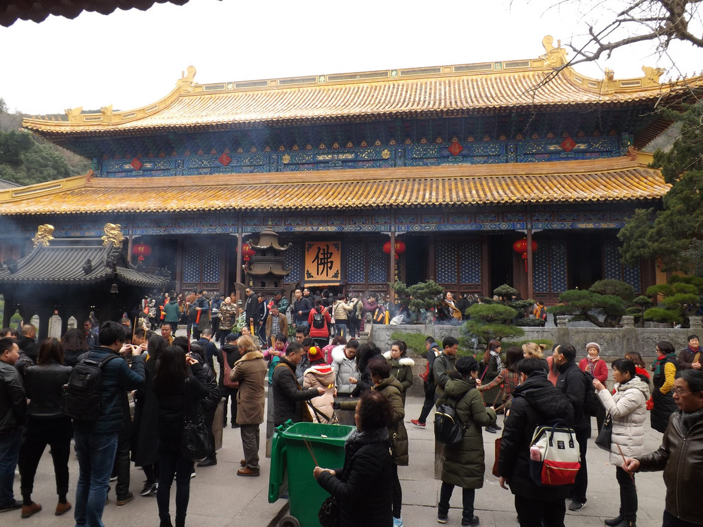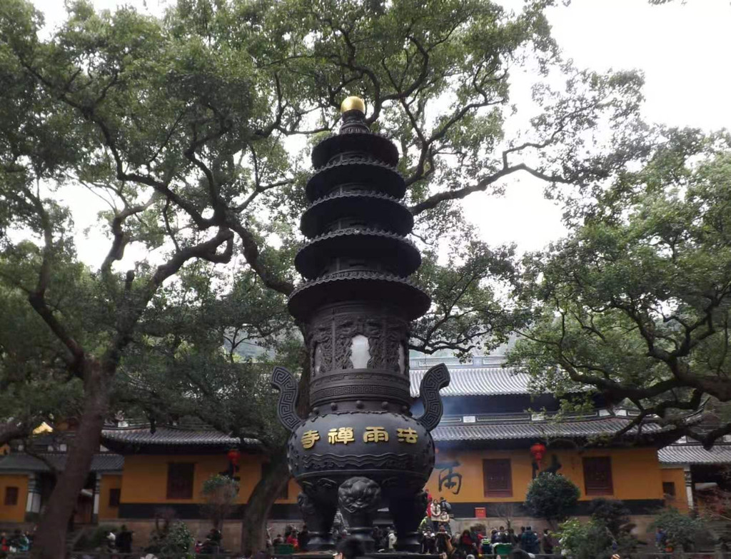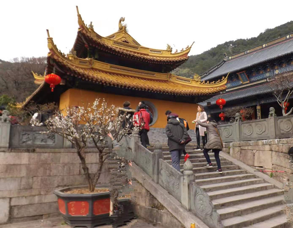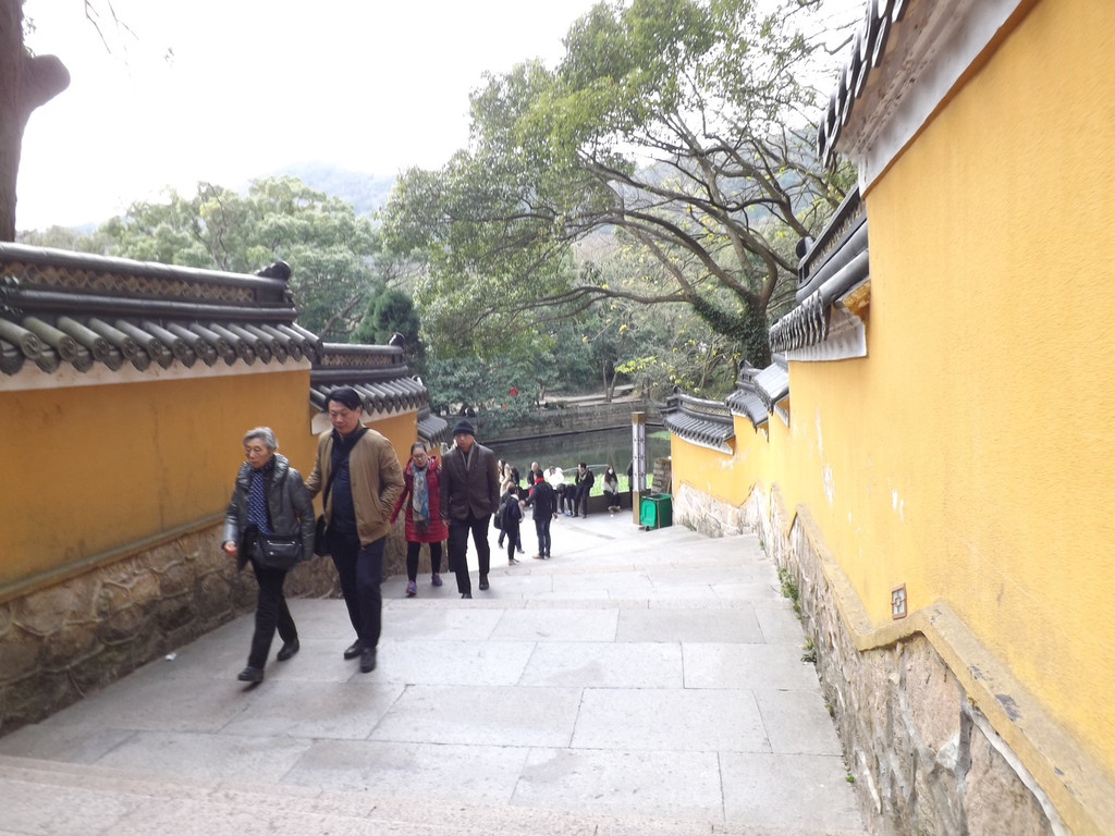 2017年3月26日,我游览了普济禅寺景区,继续游览法雨寺景区。法雨寺景区禅林成片,宗教色彩浓厚,规制宏伟的法雨寺是景区中心,寺内玉佛殿、御碑殿、九龙殿、九龙壁、二十四孝图石刻,及龙凤古柏、千年银杏等,皆为游人流连处。以供奉卧佛为主的大乘庵、供奉杨枝观音碑的杨枝庵、供奉五祖碑的净土堂、珍藏全山一千二百余件文物古董的文物馆(悦岭庵),以及鹤鸣庵、双泉庵、伴山庵,均在此景区内。