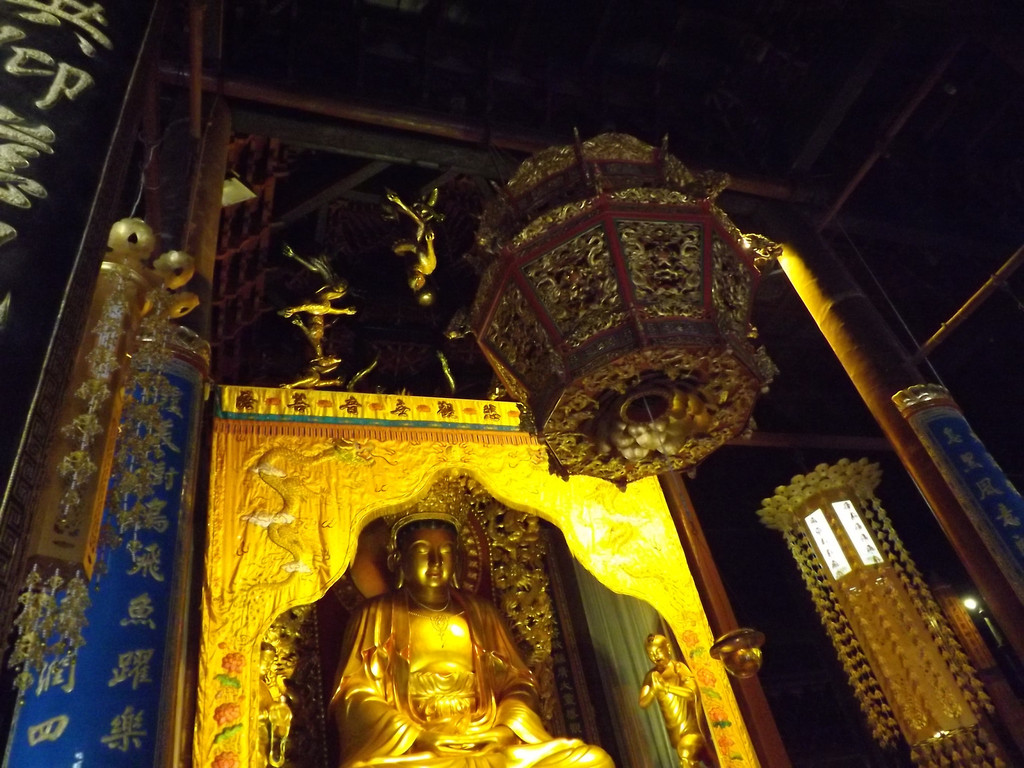 九龙殿上檐九跺斗拱,下檐五跺斗拱。殿内八根金柱的柱础是精致的雕龙砖。藻井是按古朴典雅的九龙戏珠图案雕刻的,一条龙盘顶,八条龙环八根垂柱昂首飞舞而下,造型优美,古朴典雅。正中悬吊一盏琉璃灯,宛若一颗明珠,组成九龙戏珠的立体图案,九龙雕刻十分精致生动,九龙殿内的九龙藻井及部分琉璃瓦从南京明代宫殿拆迁而来,甚为珍贵。殿内有普陀山风景名胜区三宝之一的九龙藻井,精工巧作,栩栩如生,艺术价值极高,为国家级文物。殿内正中供奉高6.6米的毗卢观世音坐像。后壁为大型海岛观音及善财五十三参群像,两旁列十八罗汉。殿内柱磉均透雕蟠龙,刀法粗犷,系明万历时雕刻。