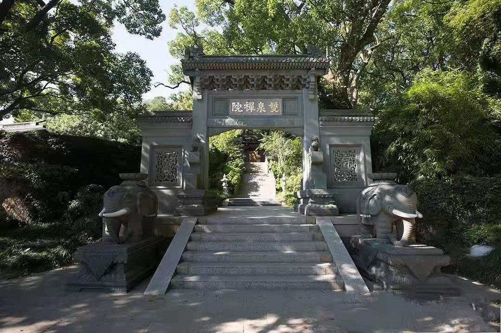 双泉禅院位手象王峰东北麓下。据清康熙《南海普陀山志》等记载,明万历间(1573-1619)僧真静建,即开《华严经》筵,众人乏水,持咒求之,岩下双泉涌出,因名双泉庵,后废。清康熙间(1662-1722)十四世孙广信重修。光绪间(1875-1908)僧愿宗复修。民国十二年(1923)僧广印扩建。山门内庭院墙间有照壁,携“天风海涛”四个字,落款:“中华民国十一年八月长宁梁叔子敬书”。经过适当扩建,大殿正中供奉夹纻制作贴金千佛绕毗卢座像。殿宇内外古木成荫,岚光山色,明丽洁净。
