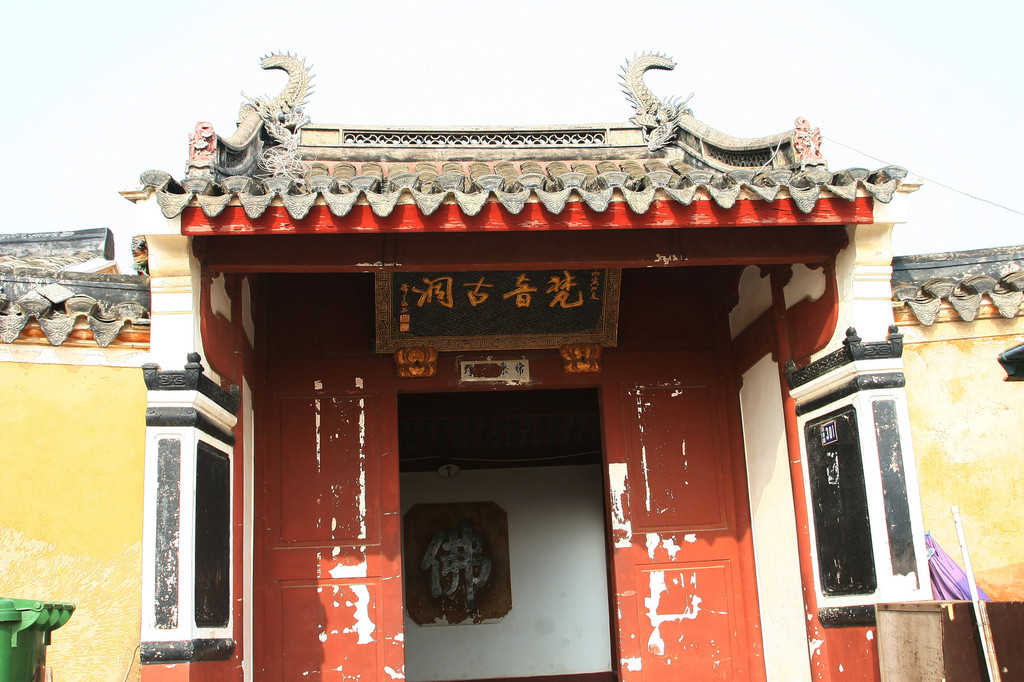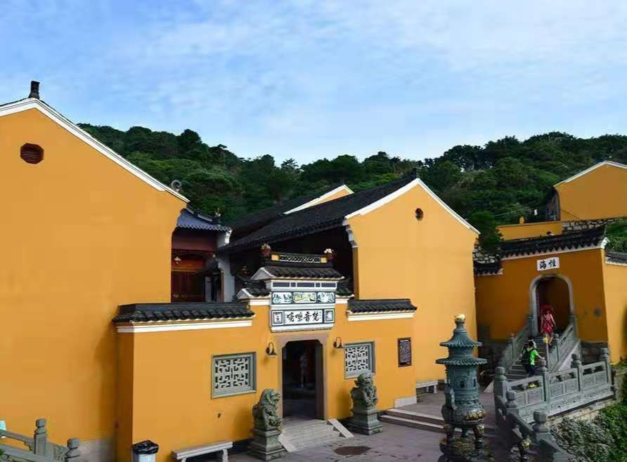 山门内甬道间照壁镌“南无观世音菩萨”七个大字。殿台两重,筑有雕栏石阶。第一重东西厢楼各6间,用作僧寮、客房和库房。西楼后有罗汉堂3间,内供奉木雕贴金罗汉立像500尊。第二重观音宝殿3间,供奉泥塑贴金鳌鱼观音立像。大殿东南隅濒海有梵音古洞,与潮音洞南北相对。梵音洞山色清黔,峭壁危峻,洞壁高80余米,宽仅3至6米,纵深约50米,深邃莫测,两崖劈裂如门,距崖顶数丈的洞腰部,中间嵌一巨岩,如巨蚌街珠,也好像是一颗含在苍龙口中的宝玉。