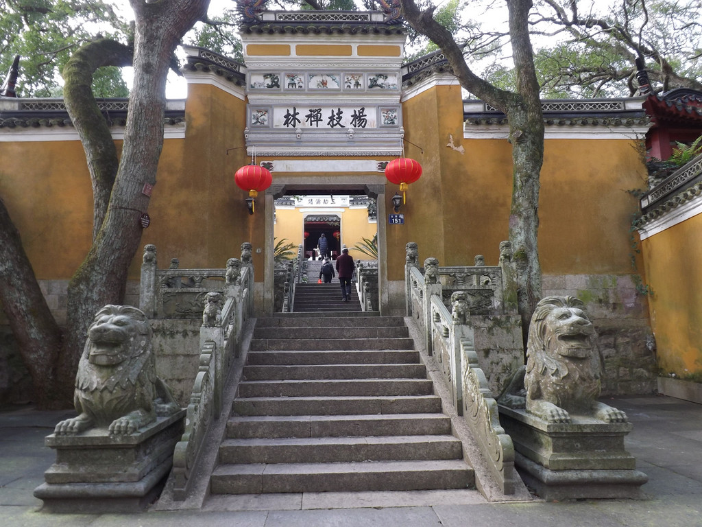 杨枝禅林位于清凉岗东下,原名杨枝庵。据清康熙《南海普陀山志》等记载,明万历十六年(1588),抗倭名将侯继高督师海疆,顺游普陀,将历年所得阎立本和吴道子所绘观音像勒石,植碑于宝陀寺(今普济寺)前殿。万历二十六年(1598),殿宇毁于兵灾,碑亦遭劫。万历三十六年(1608),宁绍参将刘炳文觅得阎立本观音碑拓本,备倭都司梁文、痒生刘聚福捐资,请名匠重新勒刻杨枝观音碑,并捐资建庵供奉,镇海禅寺(今法雨寺)住持如光建,以“杨枝庵”命名。清康熙间(1662-1722)僧通律、源升重建。光绪十八年(1892)僧开量同徒了根大修。民国十一年(1922)僧根心续修。禅院四周古木参天,拾级而上,西侧为1996年所建孙中山《游普陀志奇》碑亭,东侧为2003年增建的钟亭。大殿南北厢楼2幢,南楼后有寮房12间,北楼后为寮房和客堂。