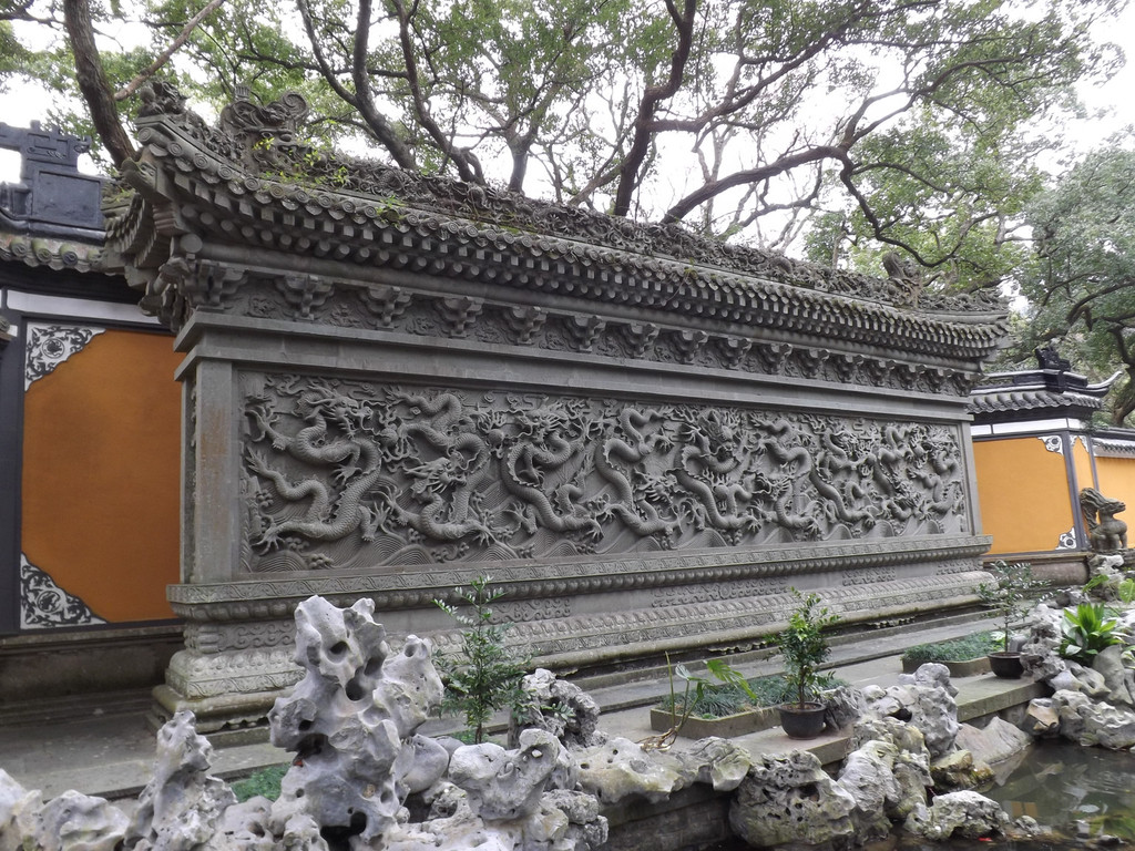 法雨禅寺门亭西是影壁,面对着天王殿,原是砖雕三龙壁,上书梵文“唵嘛呢叭”,意即神力不可思议,十年动乱中被毁。1987年,在这里建立了九龙壁一座,宽12米,高2米,厚1米,全部用青石浮雕砌成,群龙飞舞,栩栩如生。此壁不同于故宫、北海、大同三处的陶制九龙壁,而是用60块70厘米见方的青石拼接,雕刻嵌镶精致,不露缝隙,犹如一整块大石板雕刻而成。全壁高达2米、长12米,浮雕纵深16厘米,极富立体感,下盘为清式须弥座,四边顶端飞檐翘角,上部都是石梁石瓦,梁与梁之间雕有造型各异的17条小龙。壁中九龙昂首舞爪,腾飞于云山碧海之间,争夺龙珠,形态逼真。此壁由香港同胞捐款,普陀山佛教协会延请浙江温岭长屿镇民间石雕艺匠梁宗涛等人仿北京九龙壁刻制。