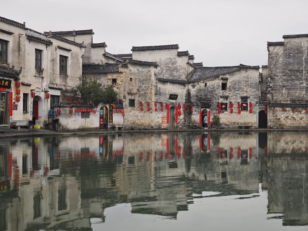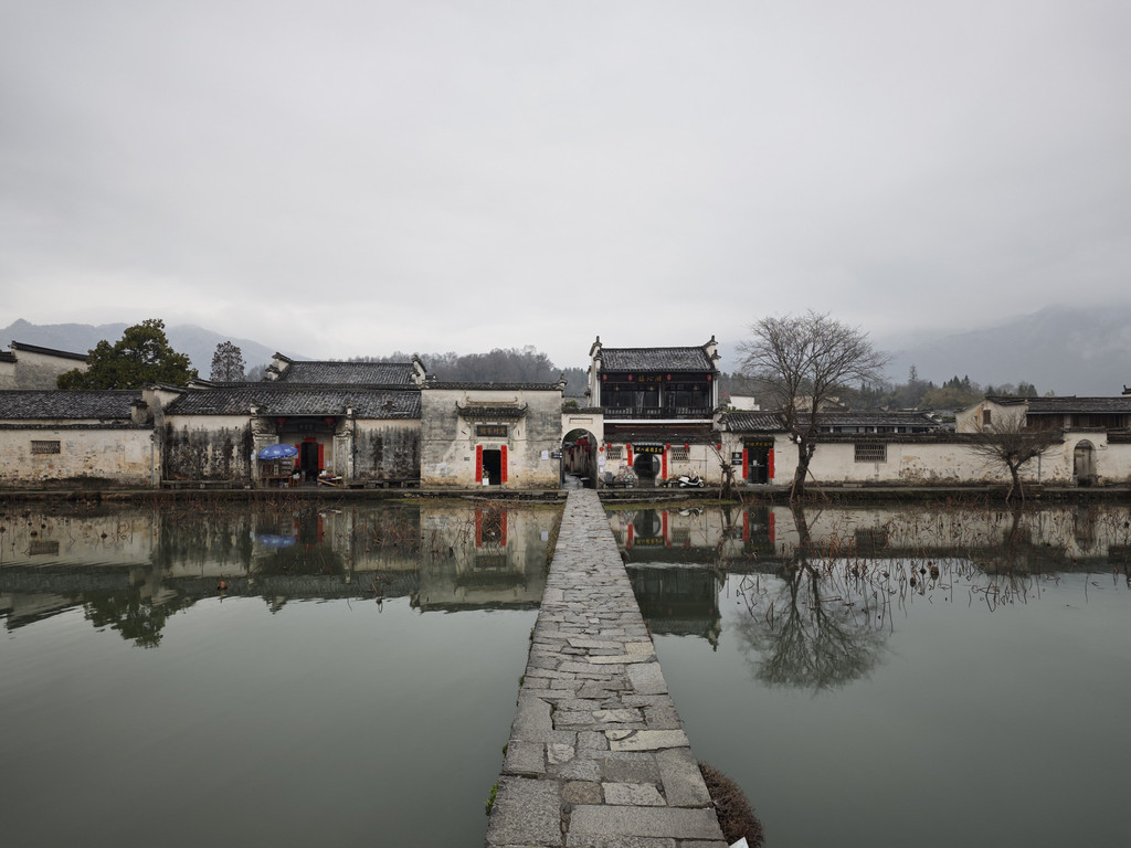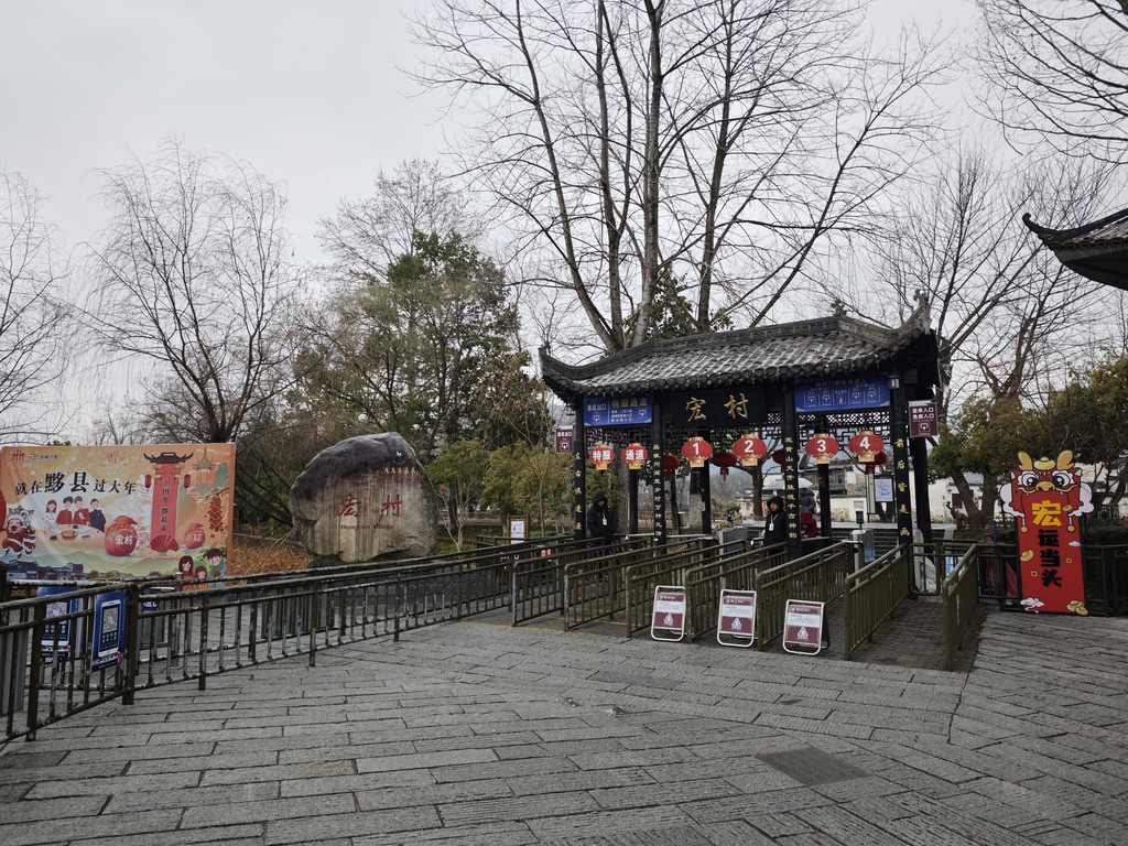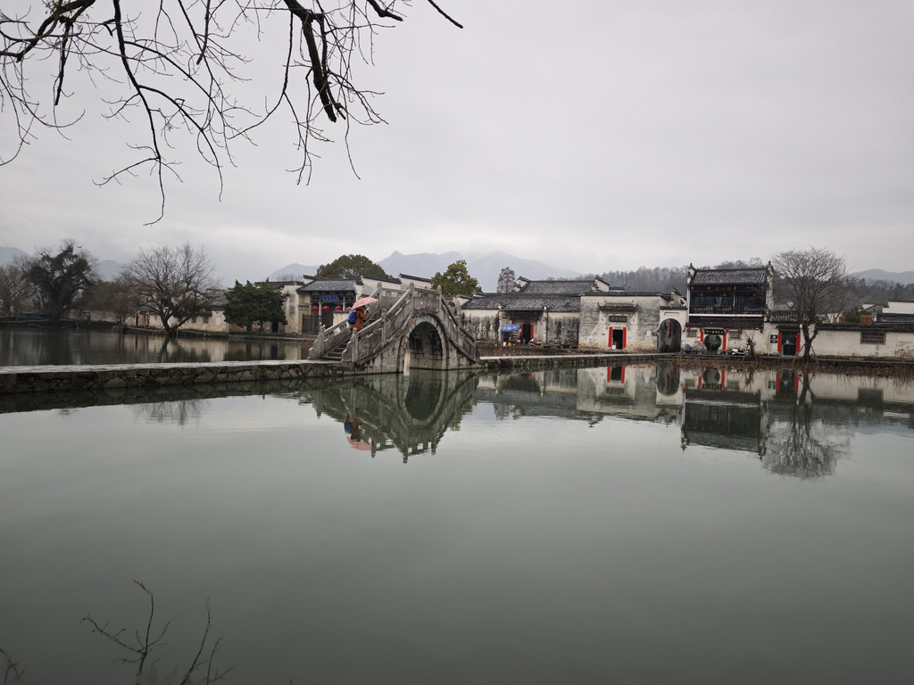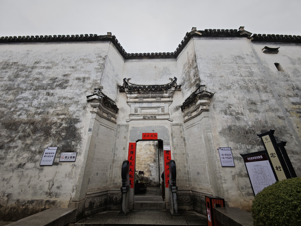 宏村景区位于中国安徽省黄山市黟县境内,是中国著名的古村落之一,是徽派古村中的代表,有“中国画里乡村”的美誉。来宏村一是看水利系统带来的水景,南湖、月沼是精华所在;二是看建筑上的徽派三雕,砖雕、石雕、木雕,人文景观与自然景观很好地融为一体。我们到宏村时天下着小雨,远山在雨雾里朦胧着,雾随着风飘动着,看到在灰蒙蒙的天色下,白色的墙壁、黑色的瓦顶,好像一幅水墨画。
