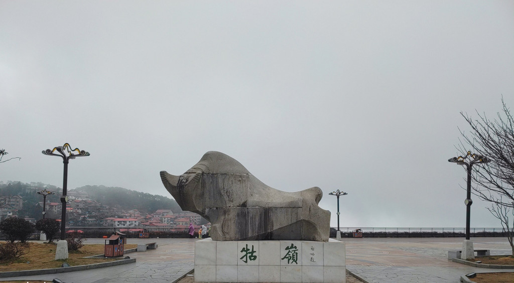 牯岭街心公园雕塑,基座上镌有现代书法家启功题写的“牯岭”二字。这头石牛表达了鲜明的主题,是牯岭的象征。