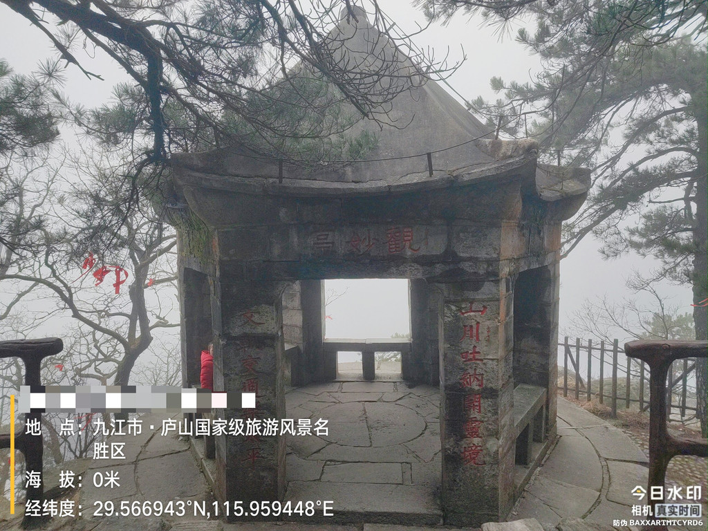 观妙亭柱上有对联“山川吐纳开灵境,文轨交通乐太平”,从这里望下去,庐山美景,一览无余。原为访仙亭是朱元璋派使者上庐山寻找周颠仙的遗迹,早被毁。1930年在原址上重建。