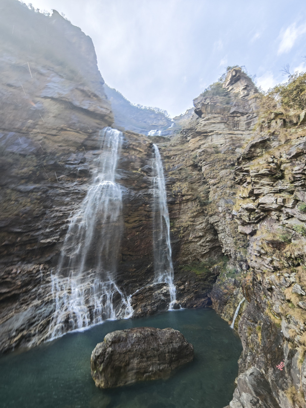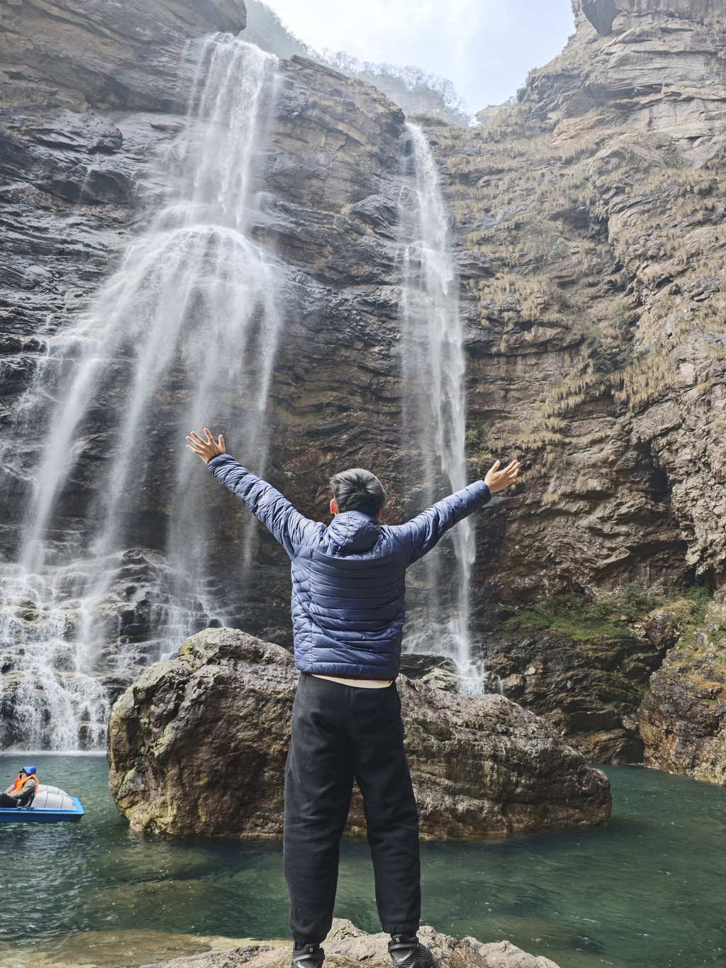 游客可以下到三叠泉边拍照,也可以坐船在泉水中转一圈。