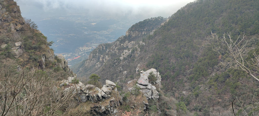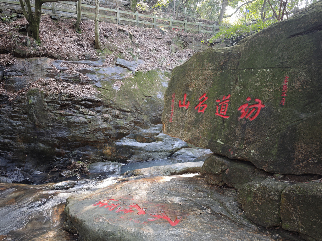 眼前突兀的山石上一株苍松在巨石裂缝中卓然挺立,树龄在千年以上,名“石松”。巨石横卧路旁山间,宛若一只大蟾蜍,故而得名蟾蜍石,巨石上刻着“纵览云飞”和“豁然贯通”,为清末民初著名诗人陈三立所书。