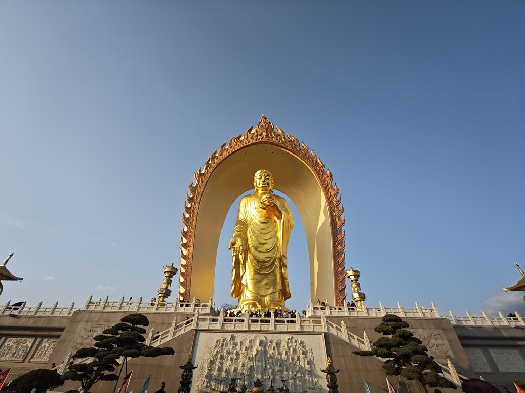 游客排队跟无语菩萨照相,有工作人员维持秩序。