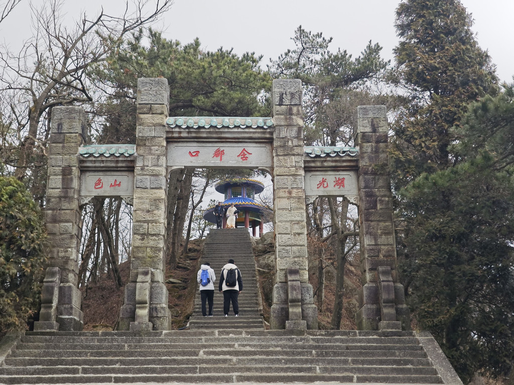 石坊四柱三门,中央镌有"含鄱口"字样,其左右分别刻有"湖光"、"山色"四字。