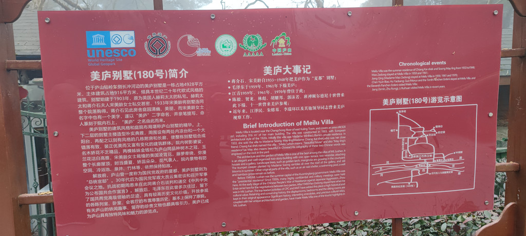 美庐——庐山因为别墅成为避暑名山,漫山遍野的别墅群让你眼花缭乱。庐山被联合国教科文组织以“世界文化景观”批准列入联合国世界遗产保护名录。联合国教科文组织的专家在庐山考察时,庐山独具魅力的别墅建筑给专家们留下了极为深刻的印象,被誉为是庐山文化宝库中的奇葩,是中国四大别墅群之一。