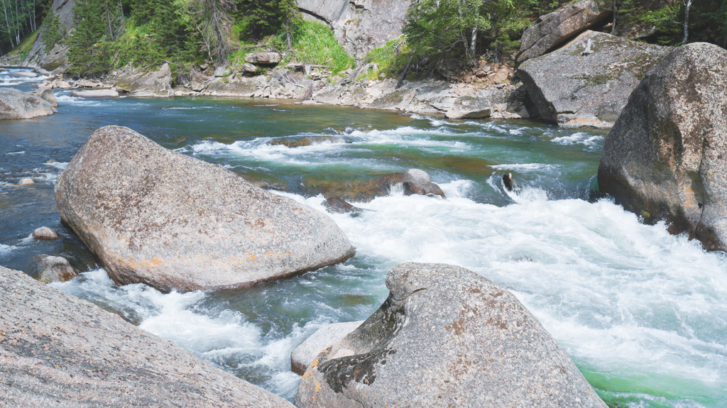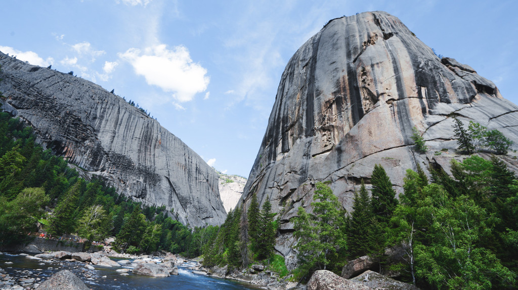 再往里走,就是额尔齐斯大峡谷了,峰壁圆浑,形态多样,尤以相对高度365米的花岗岩奇峰神钟山令人叫绝。刚好在河流的转弯处,孤峰傲立。有意思的是,花岗岩山峰表面布满了竖直沟槽,就像凝固住的巨瀑化石一般。
