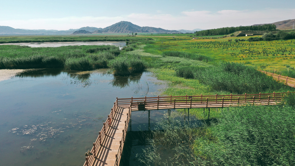 间或一只只野鸭、灰鹤、鸿雁,振翅飞过,一派沙鸥翔集、鱼翔浅底的美妙景色。走在岸边的栈道上,真的是心中不自觉的就会浮出浪漫二字。