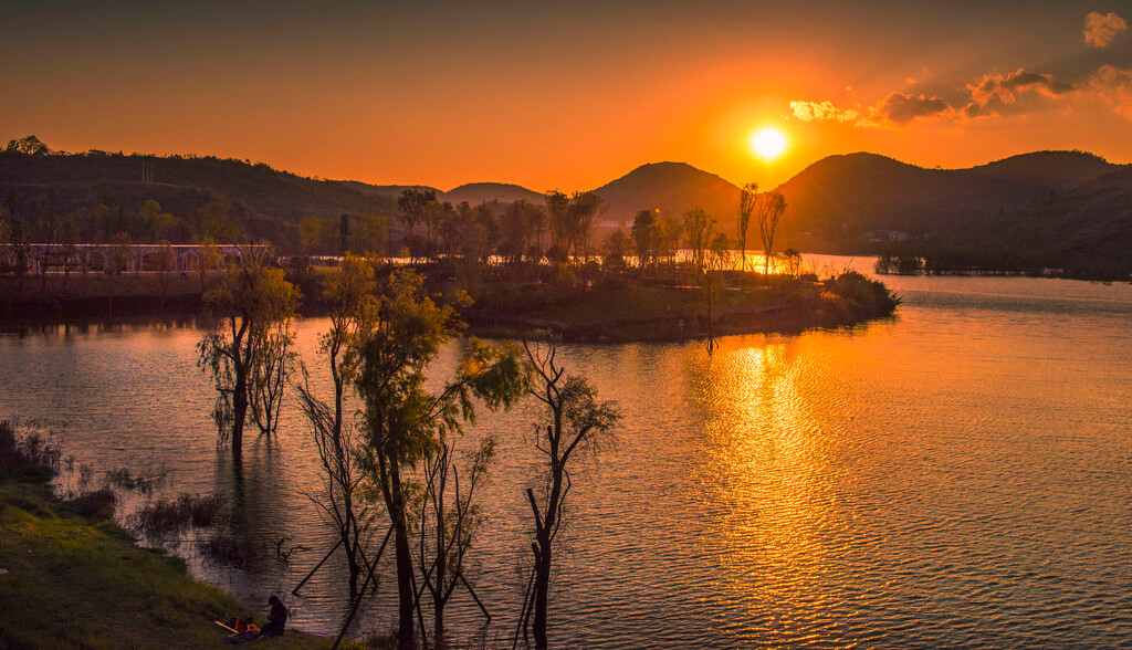 小镇边上有个湖,阳光微晞时候,湖面泛起细碎的光,日落沉沉的时候,湖水也被映红。这一抹水色,给整个木制石制的小镇披上了温柔的一层纱。