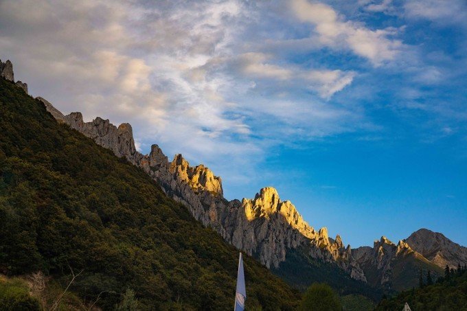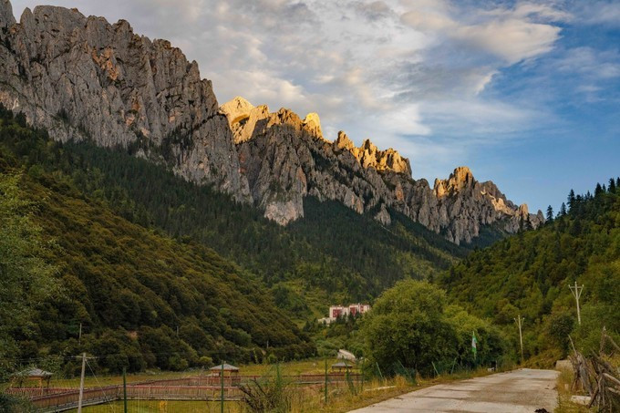 而且雪巴沟里的山峰也很奇特,在一大片森林后面,突然拔地而起一些寸草不生的陡峭山峰,就像是被打磨得很光滑的刀锋一样,特别有视觉冲击感,如果运气好,还能在傍晚时分看到 日照 金山。刚好我们回雪巴沟酒店时,就看到过一次的 日照 金山的尾巴,只能在车上隔着车窗抓拍一张,如果停下车拍估计也来不及了。